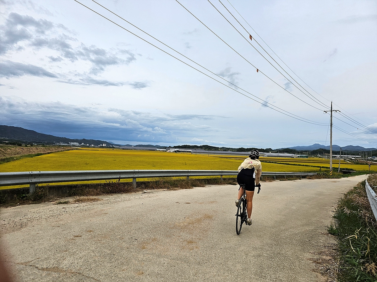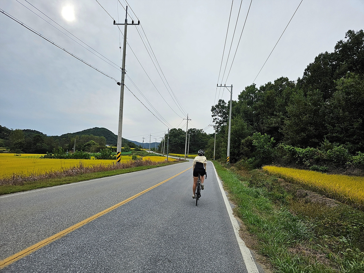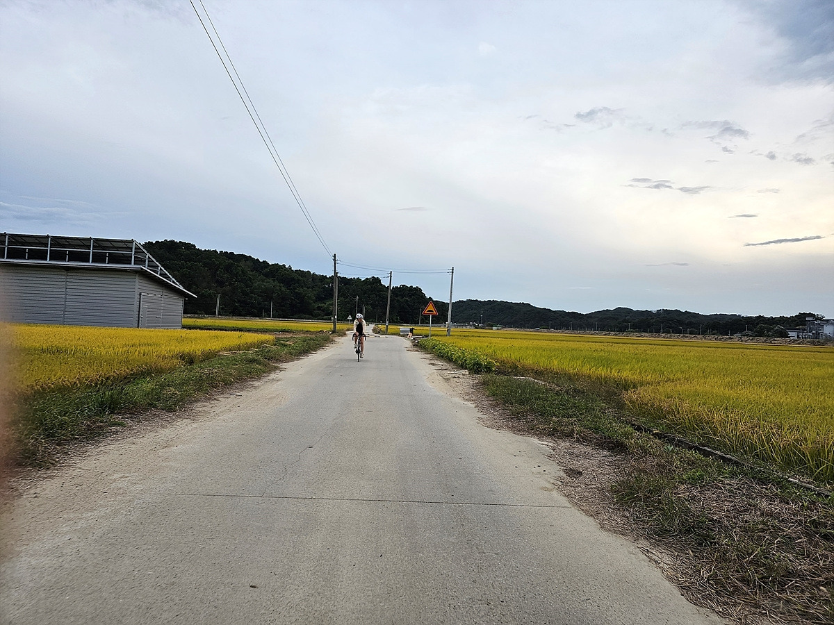 아주 작은 길이지만 노면은 좋은 편이다. 차는 거의 안 다니고 수확을 기다리는 노란 논이 군데군데 펼쳐진다.