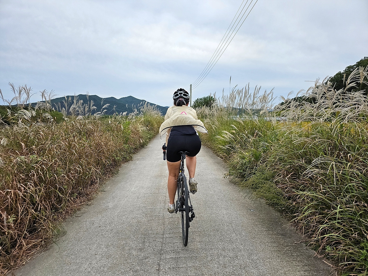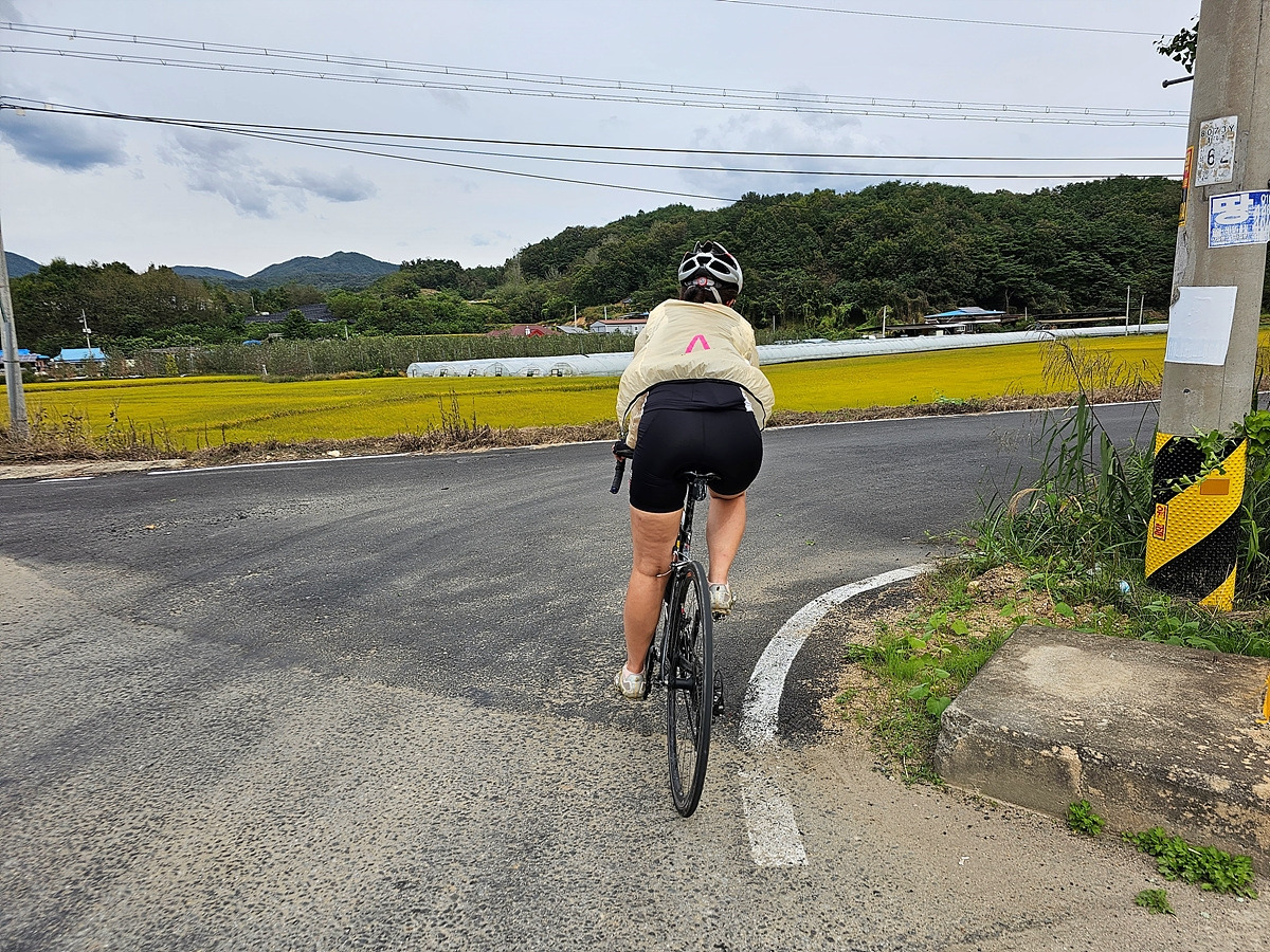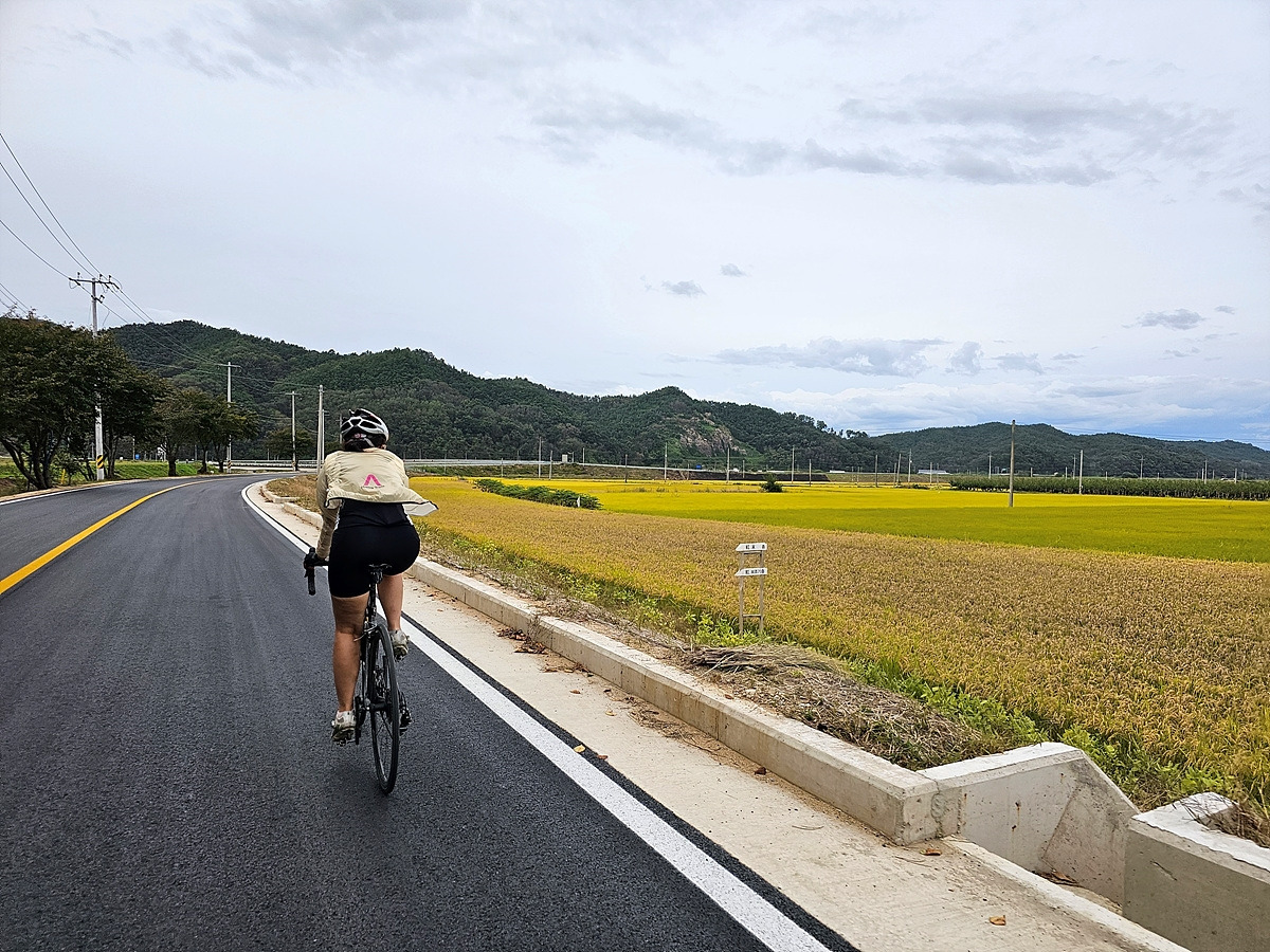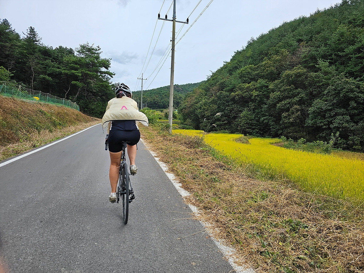 아주 작은 길이지만 노면은 좋은 편이다. 차는 거의 안 다니고 수확을 기다리는 노란 논이 군데군데 펼쳐진다.