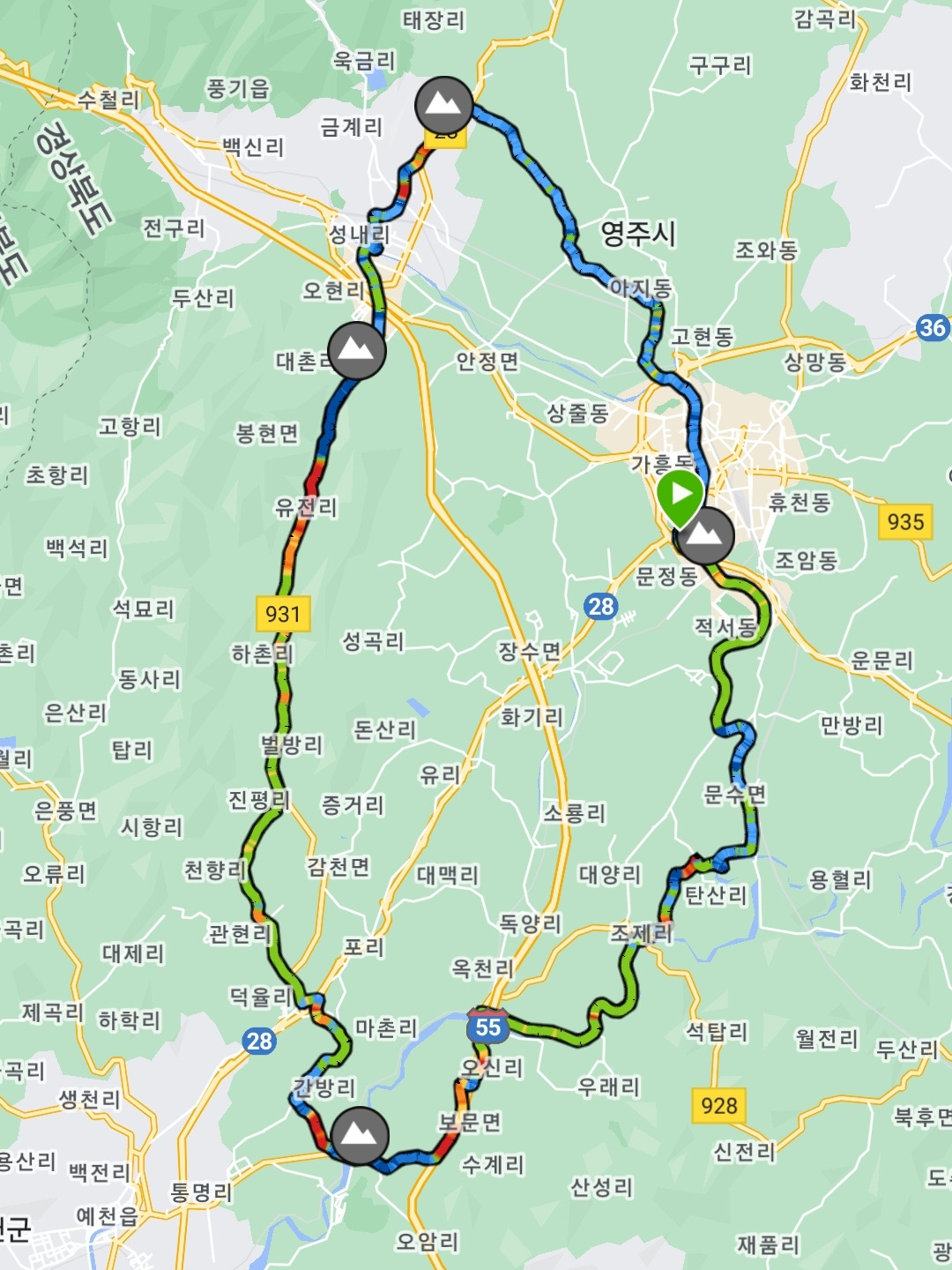 예천 충효테마공원을 지나면 928번 도로인 보문로와 만난다. 이 길은 중앙고속도로 예천 톨게이트가 나오는 길이고 예천 근처에서 자전거를 타다 보면 몇 번 지나가게 되는 곳이다. 서천과 만나 물줄기가 커지는 내성천 옆으로 자전거길이 있긴 한데 비포장길이라 로드바이크는 928번 도로로 언덕길을 넘어가야 한다.