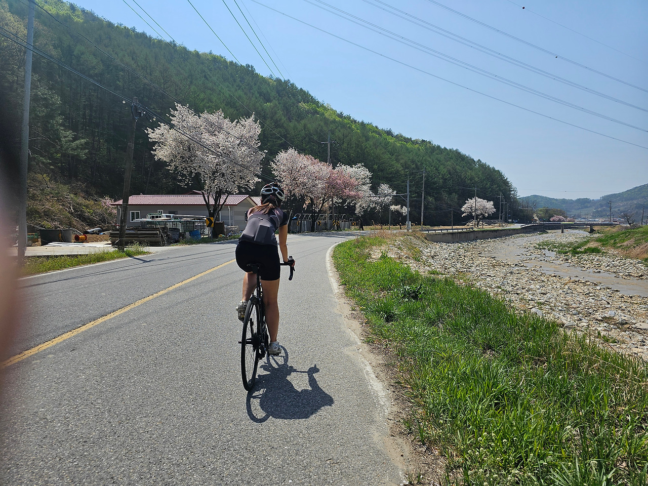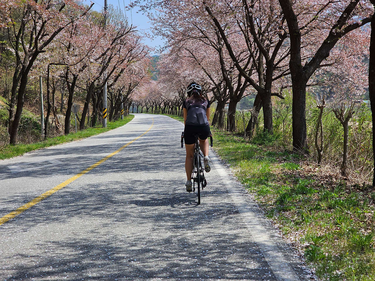 언덕길을 내려가서 다리를 건너면 작년 말에도 다녀갔던 기곡리 쪽으로 우회전한다. 여기도 벚꽃길이 멋질 것 같았는데 다 떨어져 버려 아쉽다. 거의 다 떨어지고 남은 흔적만으로도 대단한 벚꽃길인 것이 느껴진다.