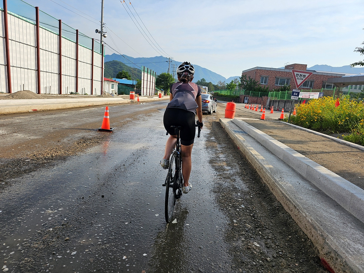 마침 이쪽도 도로 공사 중이다. 바로 앞에 살수차가 지나가면서 도로에 물을 잔뜩 뿌려 사람도 자전거도 엉망이 된다.