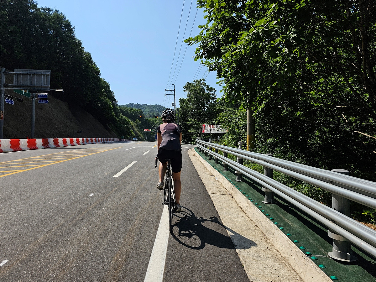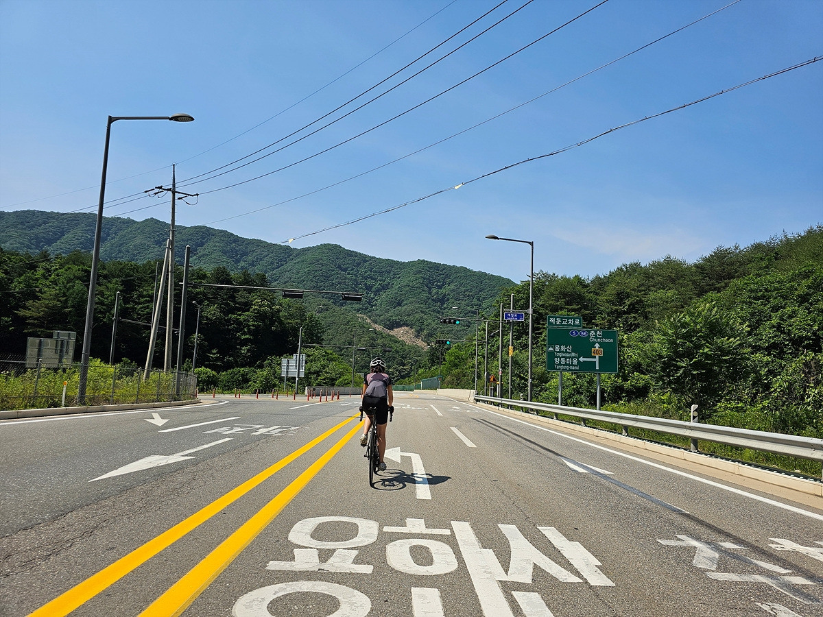 국도라지만 그나마 갓길이 좀 있다. 갓길로 조심조심 간척사거리까지만 달리면 된다. 자전거도로 (우회도로이용) 표지판은 추곡 터널을 우회하는 양구옛길 안내판이고 저 표지판을 따라가면 배치고개, 하오고개, 부귀고개의 지옥 오르막길 코스가 이어지는 실패한 우회도로다. 우리는 좌회전해서 461번 지방도를 따라 화천 쪽으로 가야 한다.