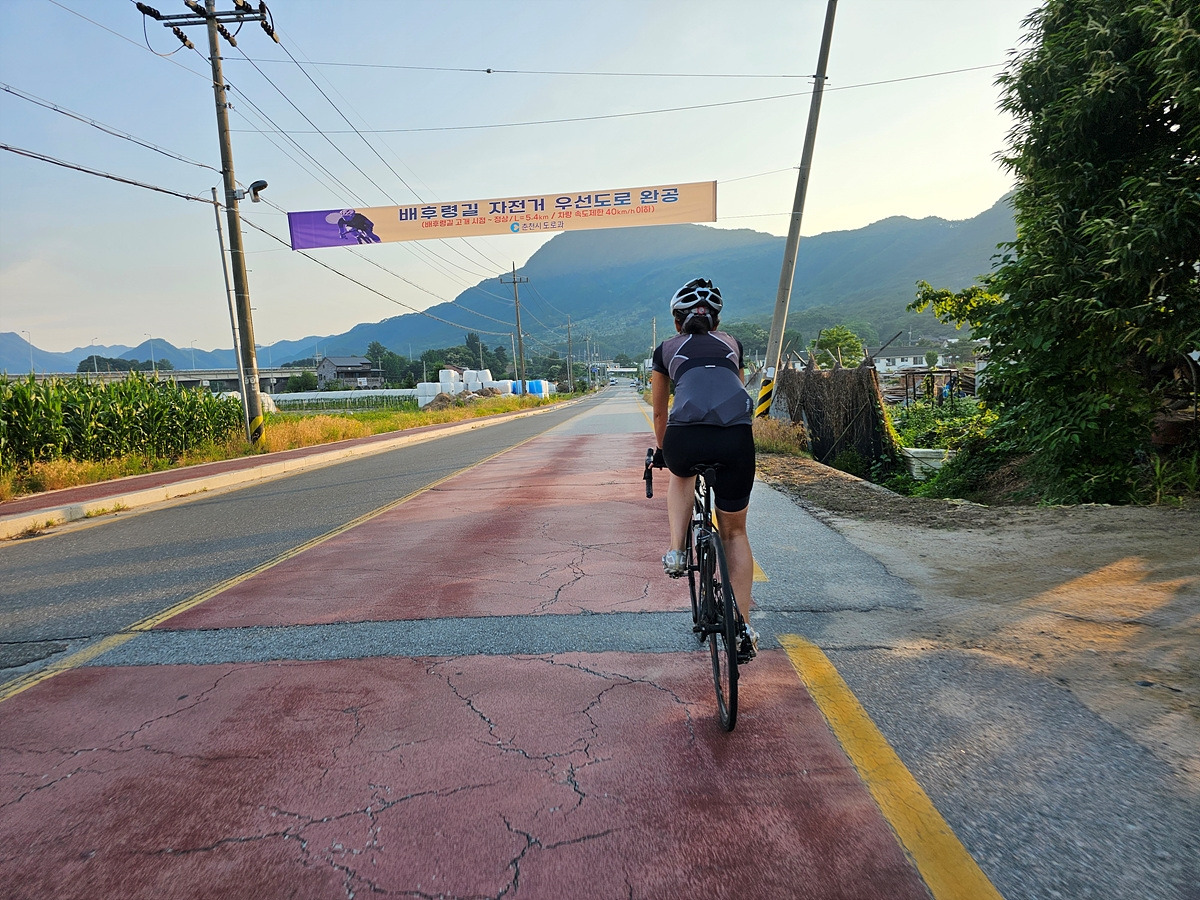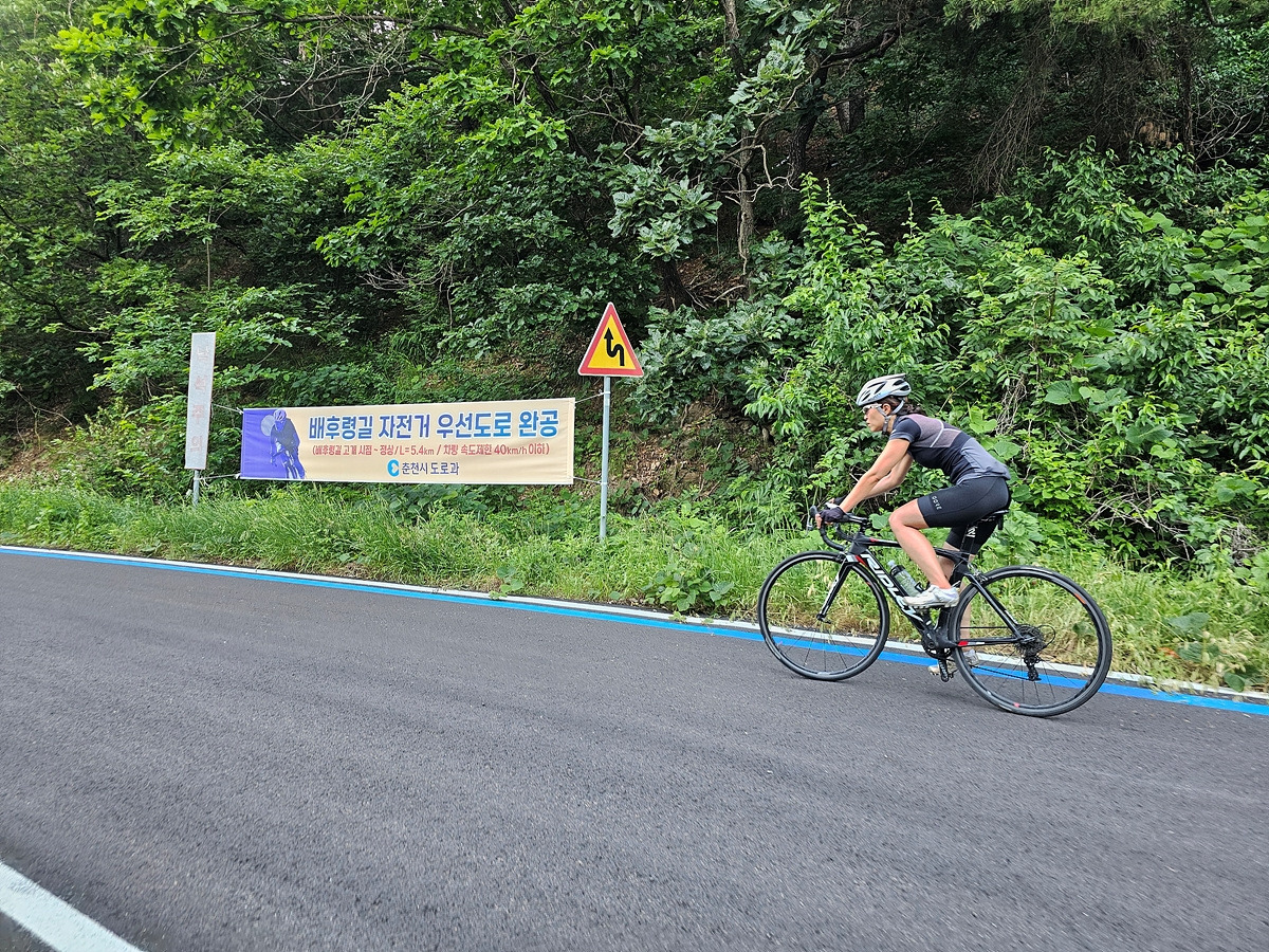 생각지도 않았지만 마침 배후령길 자전거 우선도로가 완공되었다는 현수막이 붙어있다. 그러고 보니 내일 배후령길에서 대회가 있는 것이 기억난다.