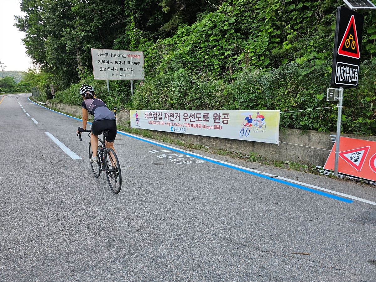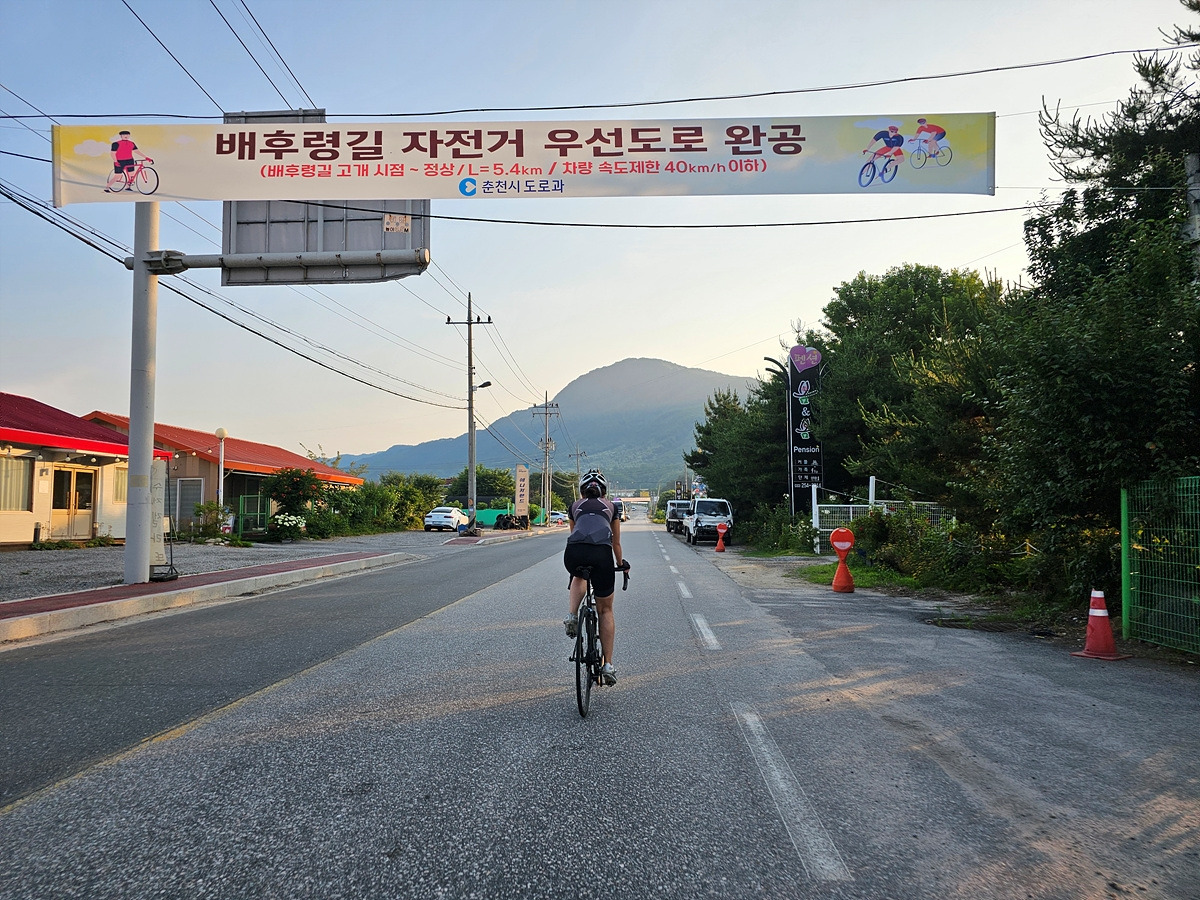 배후령 오르막길이 시작되었다. 여기도 플래카드가 여기저기 붙어있는데 확실히 길이 정비된 것이 느껴진다. 예전에는 도로와 도로 옆 바위절벽이 무너지면서 여기저기 돌조각이 많이 굴러다녔다. 열심히 자전거길을 완공해 놓고 대회까지 열리는 춘천의 대표 자전거 코스니 이렇게 잔뜩 붙여놓을 만도 하다.