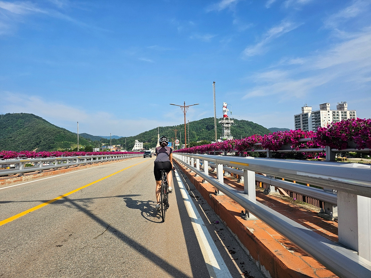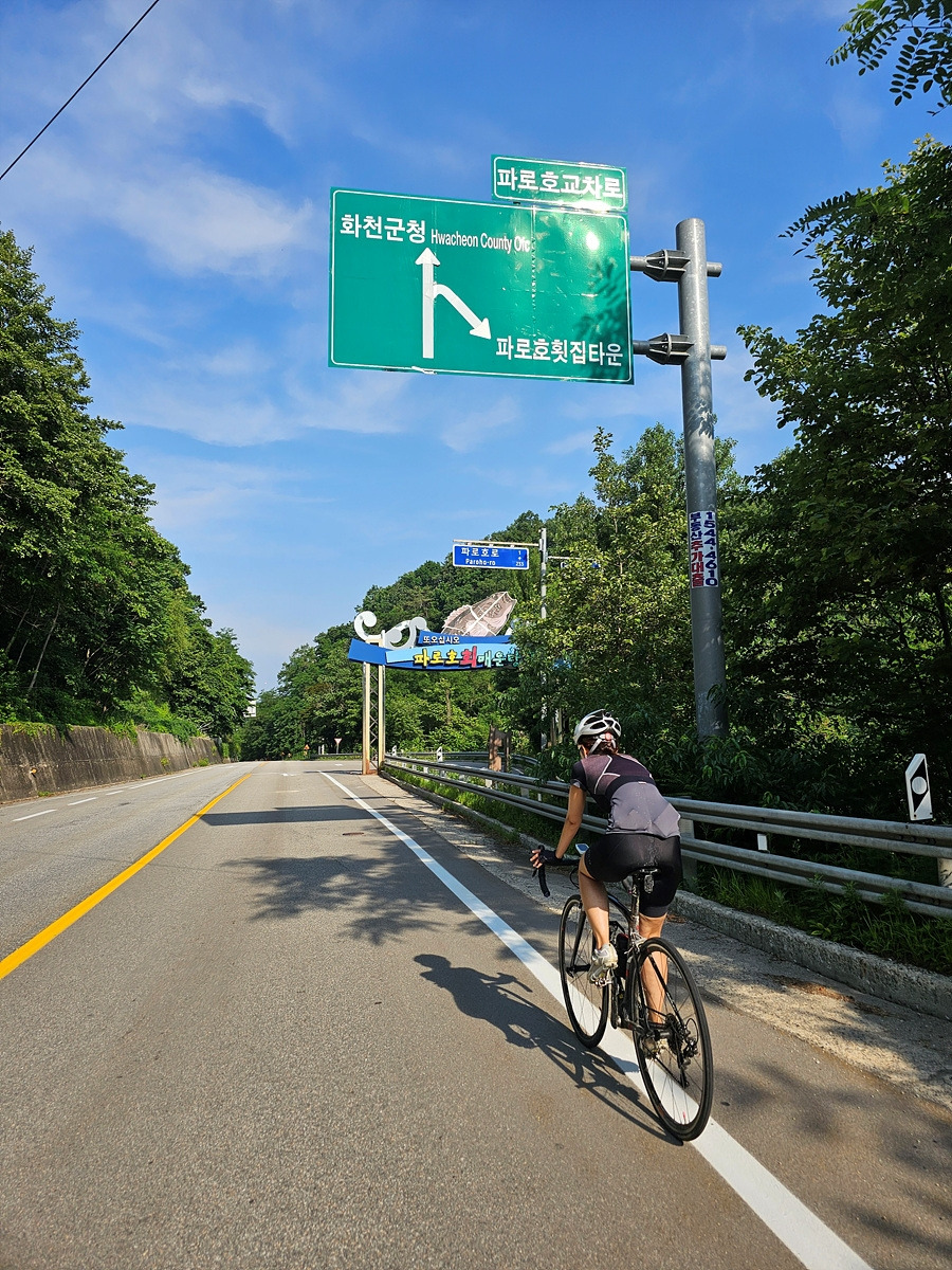 파로호 횟집 타운 입구인 파로호 교차로를 지나 다리를 건너면 이제 북한강 자전거길의 상류 구간인 화천 산소길로 가면 된다.