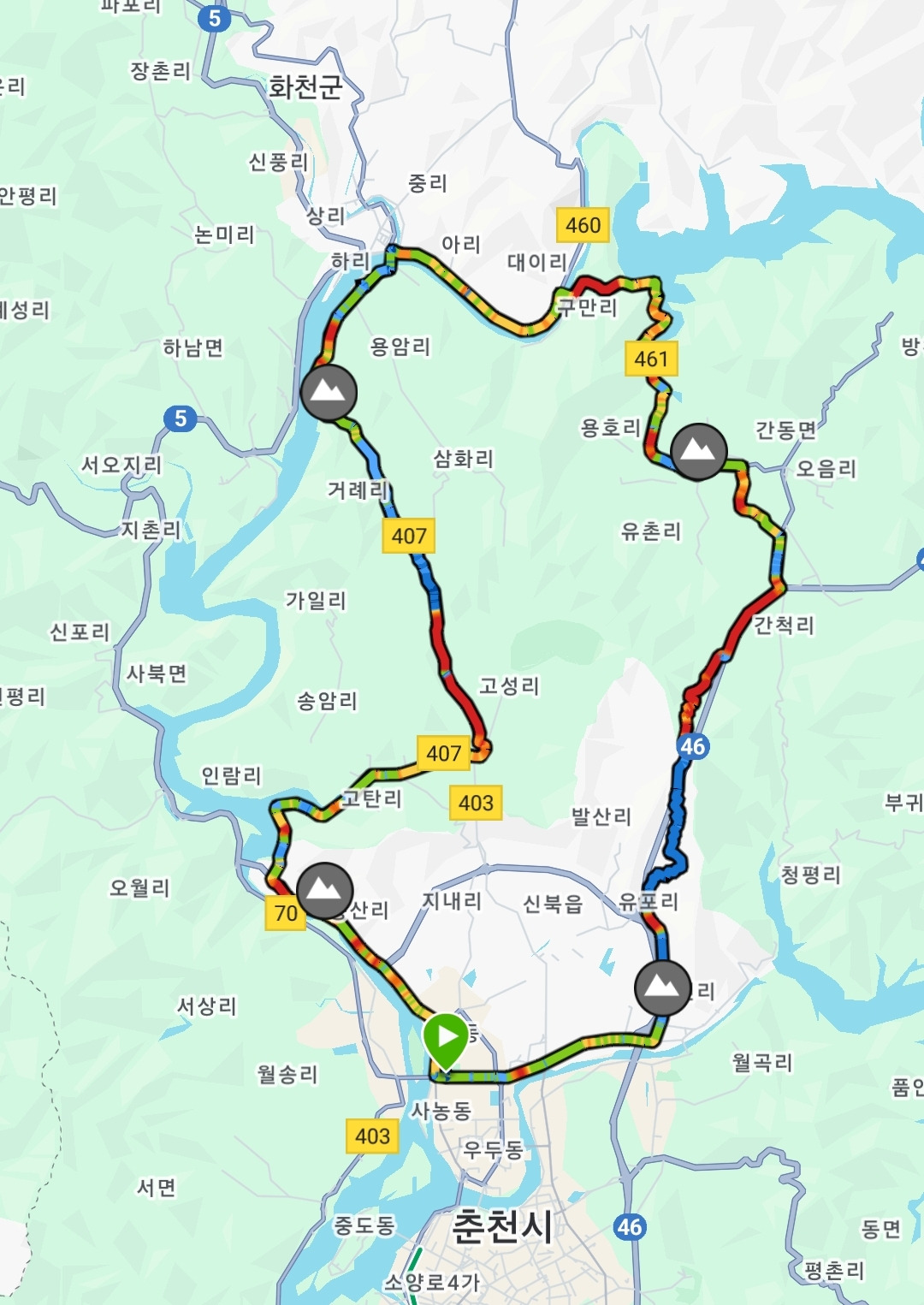 춘천과 화천의 대표 호수와 강을 따라 배후령과 부다리길을 달리니 춘천을 대표할만한 코스라 할 수 있다. 꽤 더워지기 시작했으니 일찌감치 다녀왔는데 이 길은 원래 아침 일찍 달려야 차량 통행이 적은 길이다. 꼭 이른 아침에 달리기를 추천한다.