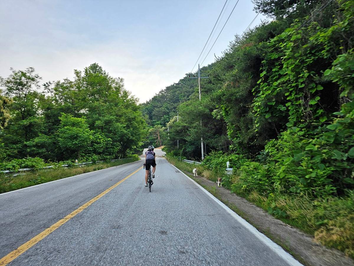 상천초교를 지나고 춘천 공원묘원이 있는 작은 오르막길도 지나면 이제 배후령길이 시작된다. 길가에 개들이 돌아다니는데 사람한테 덤비는 녀석들은 아니었다.