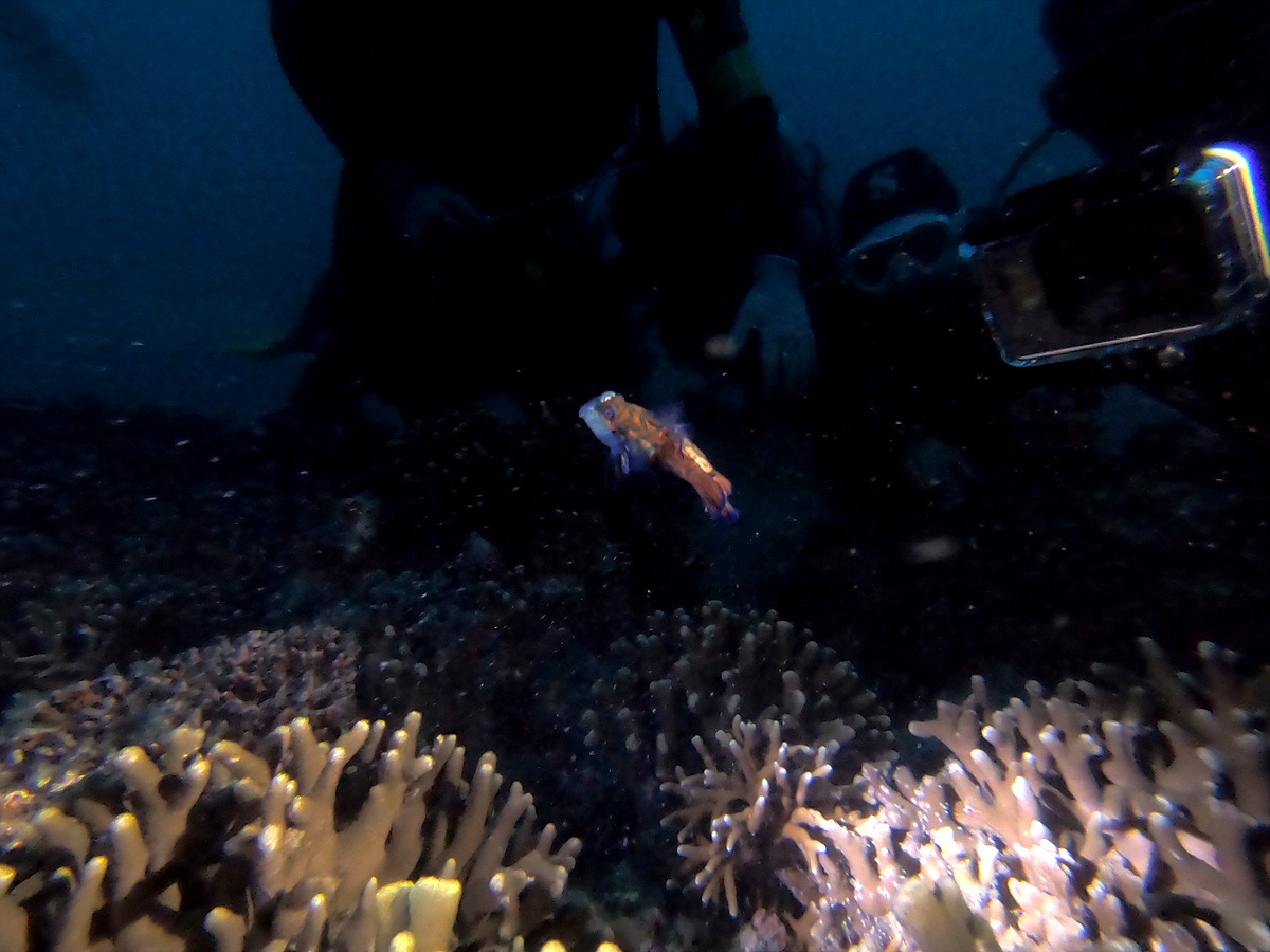 만다린 피쉬 짝짓기가 끝나면 완전히 어두워진다. 밤에는 낮에 안 보이던 게나 큰 물고기들이 돌아다닌다.