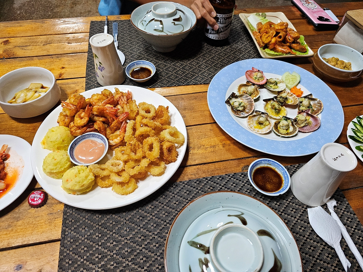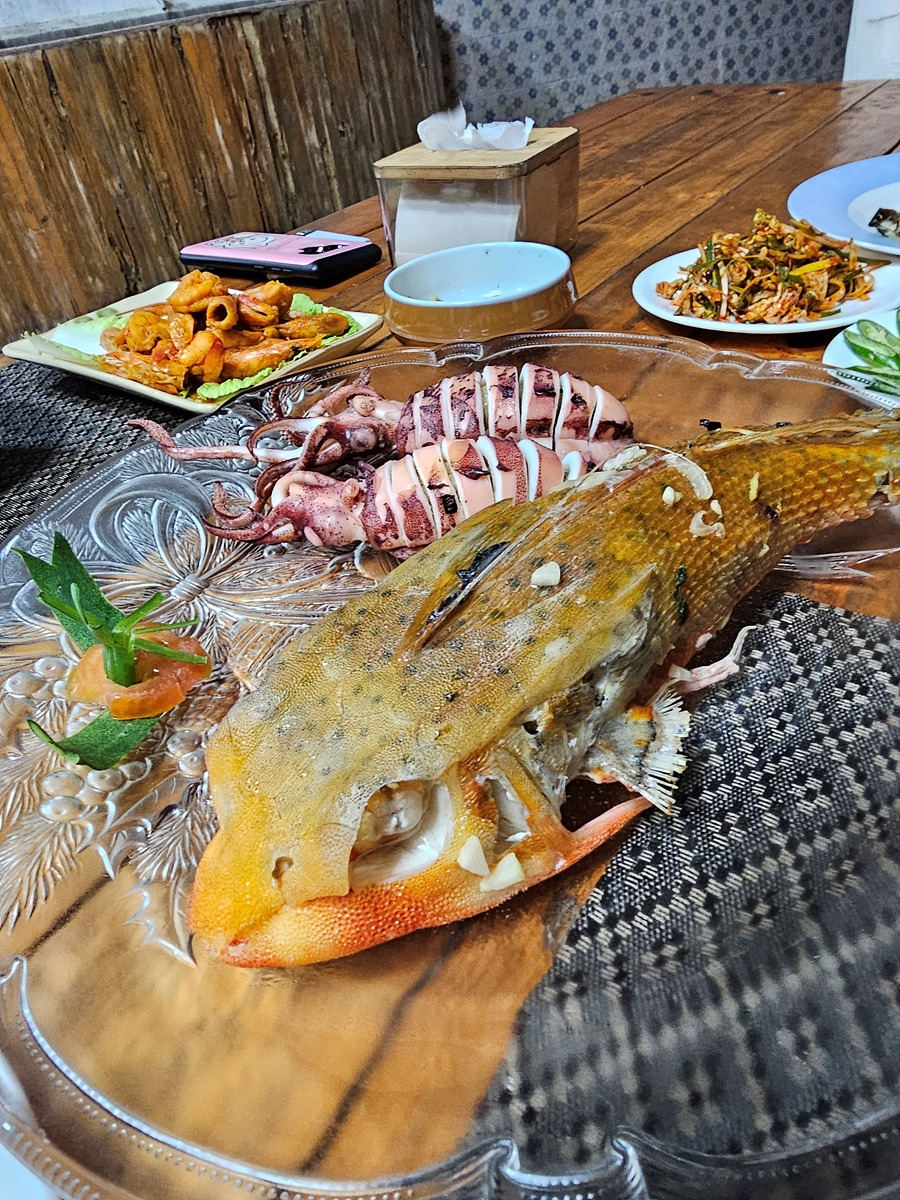 이것저것 해산물 위주로 나오는데... 아까 바닷속에서 봤던 죽지성대가 식탁에 올라왔다. 죽지성대 너 정말 맛있는 녀석이구나.