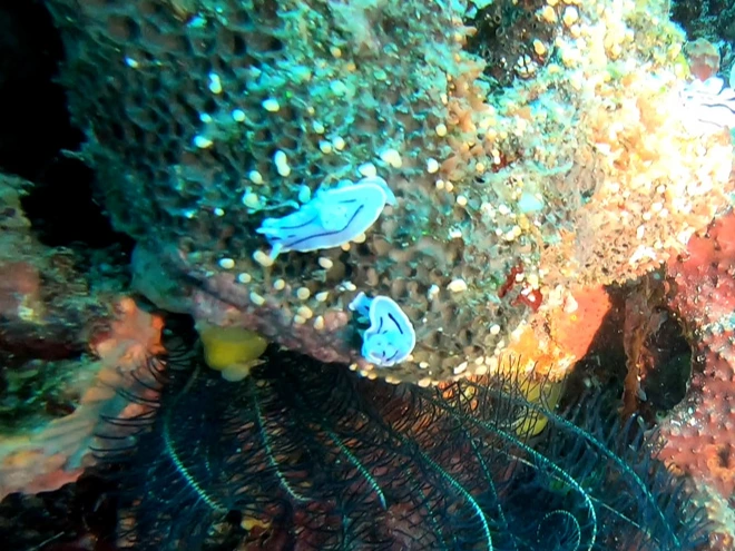 튜브 아네모네 근처에는 공생하는 새우들이 있는데 여기도 세 마리 정도의 작은 새우가 조류에 버티면서 살고 있다. 앙증맞은 크기에 나풀거리는 새우들을 한참을 들여다본다.