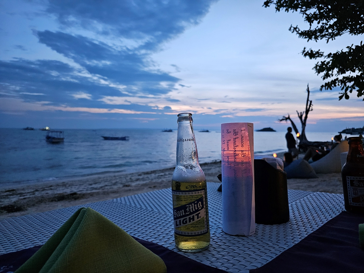다이빙이 끝났다. 마지막 저녁 식사는 이 동네에서 제일 비싼 식당인 오션비다에서 저녁을 먹는다. 비싼 가게다 보니 잡상인들이 많다. 비싼 집이지만 참 맛있다. 새우볶음은 오징어 대신 새우가 들어간 매콤한 오징어볶음 맛이었다.