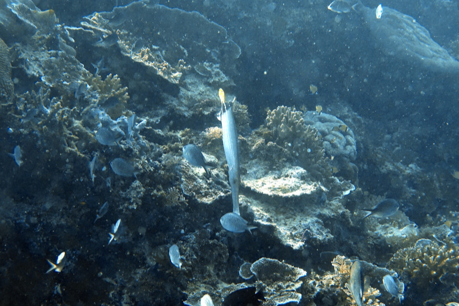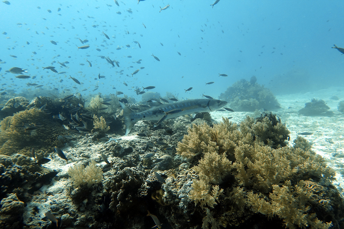 자이언트 바라쿠다. 물고기 떼 사이에 떠있는 게 멋지다.