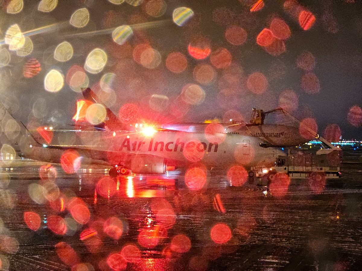 새벽 2시, 잠깐 눈을 떴더니 활주로 이륙 전 구역에서 비행기 세차 중이다. 이런 폭설에서는 안전을 위해 반드시 해야 한다고 한다. 세 대를 한꺼번에 하는데 워낙 덩치도 크고 계속 지연된 여파로 오래 걸리는 것 같다. 비행기 세차하는 것도 다 보네...