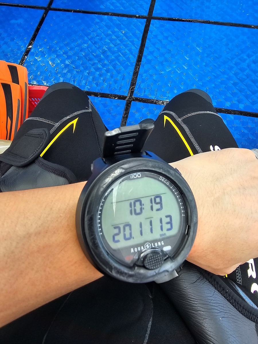 출발 전에 점검하니 내 다이브 컴퓨터가 망가졌다. 샵에서 다이브 컴퓨터를 대여했더니 단순하고 튼튼한 놈을 받았다.