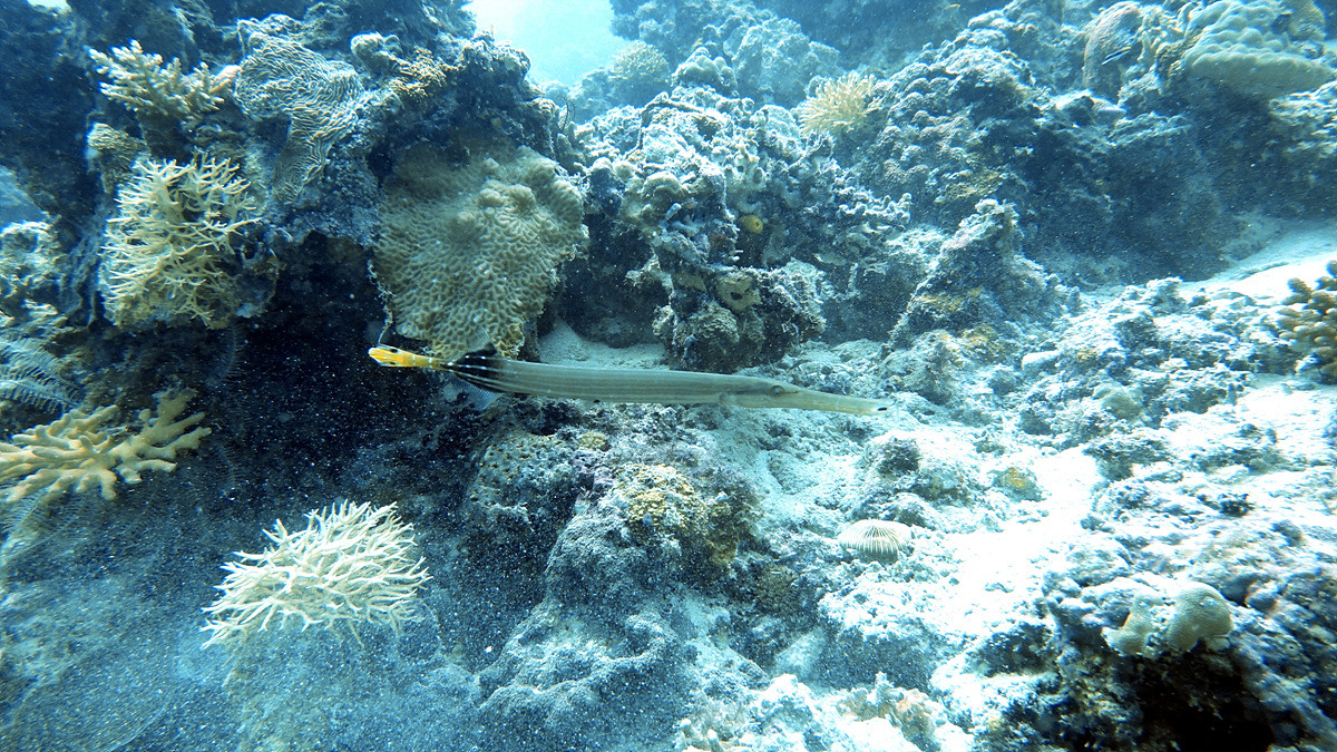 찬란한 태양빛을 받으면서 우아하게 내려오는 트럼펫 피쉬