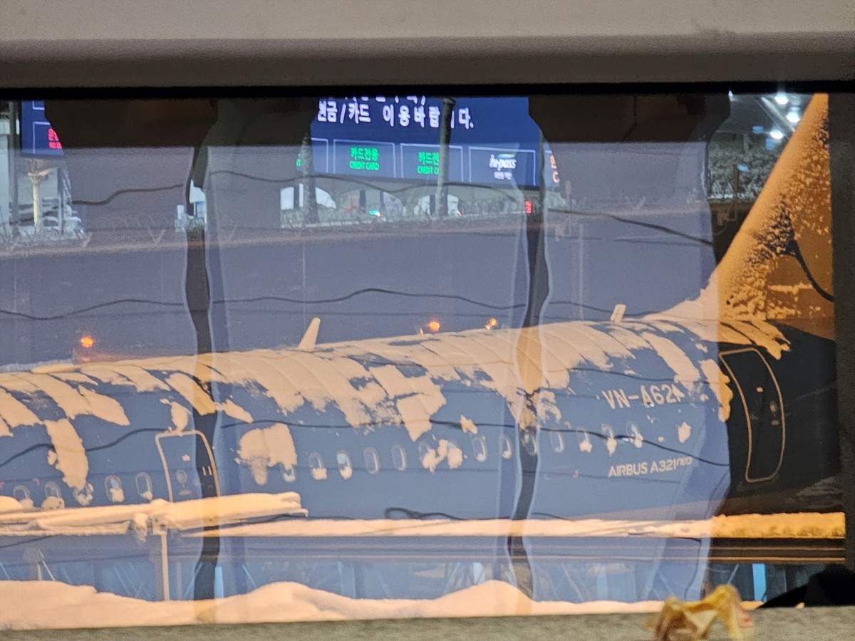 폭설은 계속되고 기장의 방송이 나온다. 비행기에 제설 작업을 하고 세척하고 이륙해야 하는데 이게 밀려있어 이륙이 언제가 될지 모르겠다고 한다. 꼼짝없이 비행기 안에서 기다려야 한다. 일단 잠부터 자자. 이럴 때는 수면 안대와 노캔 헤드폰이 큰 도움이 된다.
