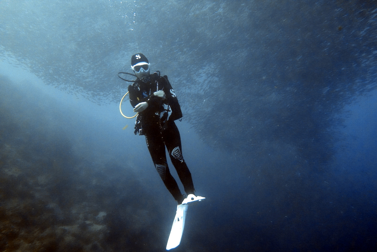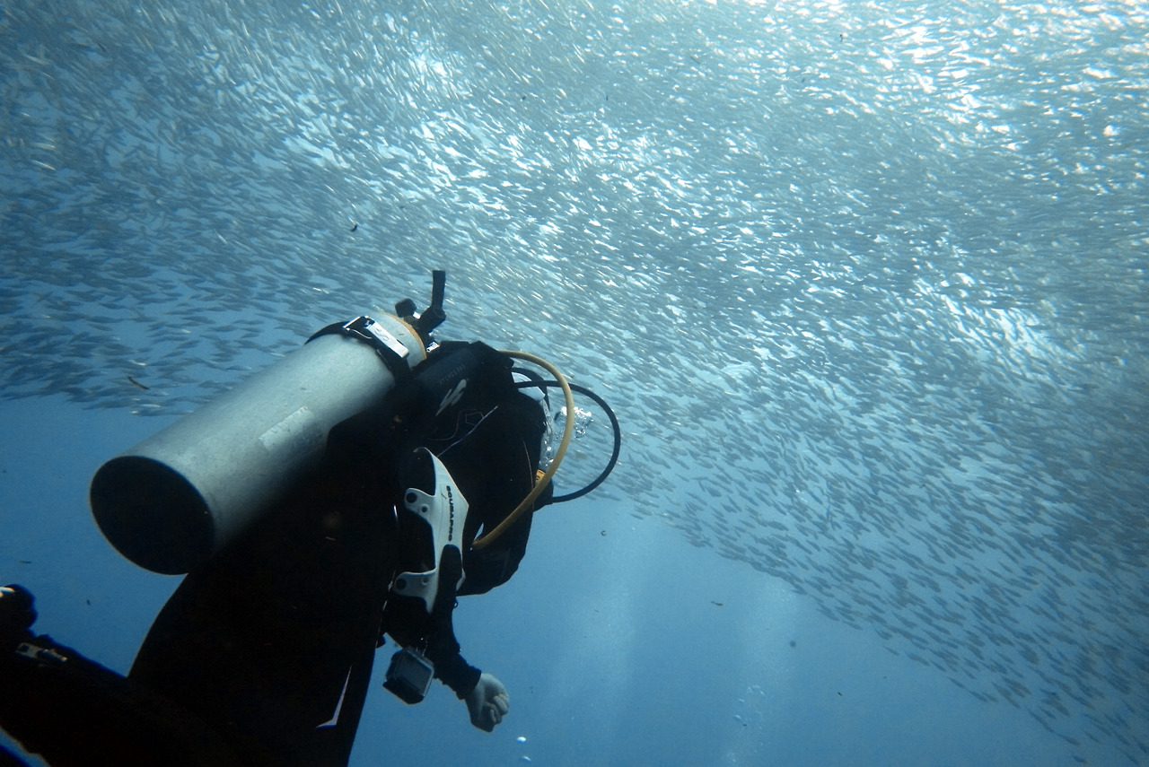 얕은 수심에서 계속 있으니 공기 소모가 적다. 정어리떼를 적당히 즐기다가 아침 먹으러 돌아간다.