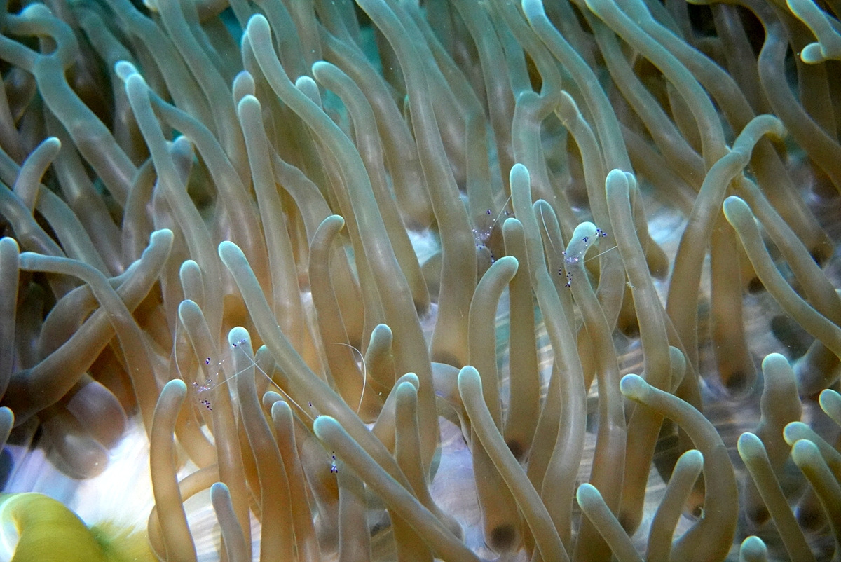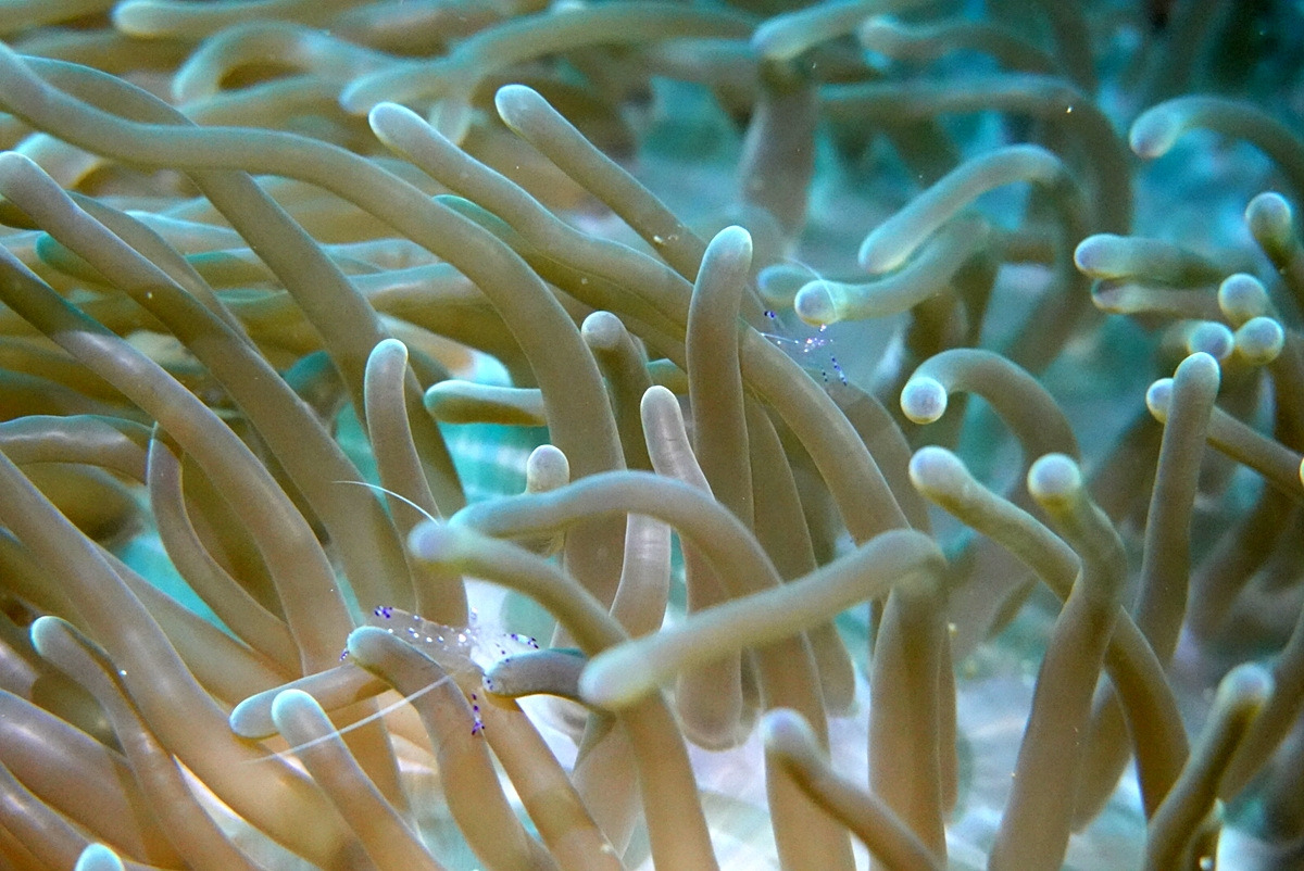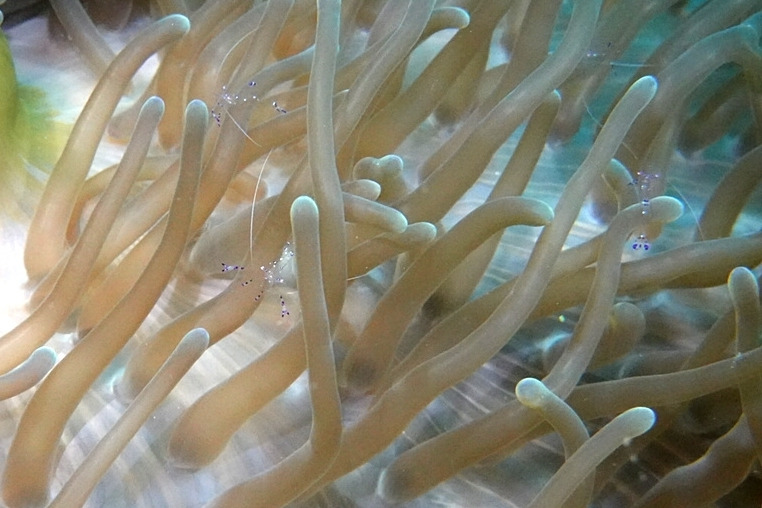 아네모네 말미잘을 자세히 살펴보면 새우들이 모여 사는 것이 보인다. 투명하고 작아서 잘 안 보이지만 보고 있으면 참 귀엽다. 집에서 새우 키우는 사람들의 기분이 이해된다.
