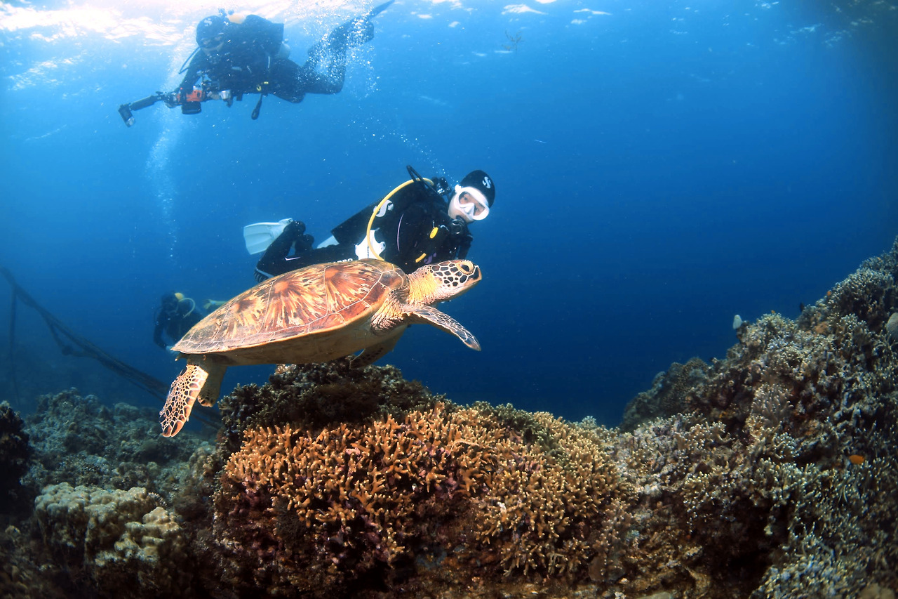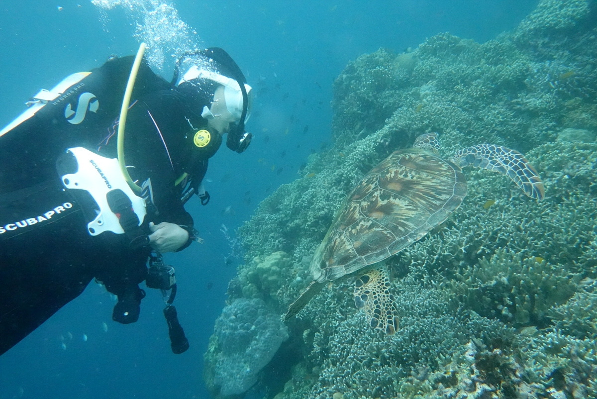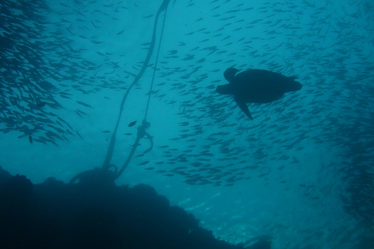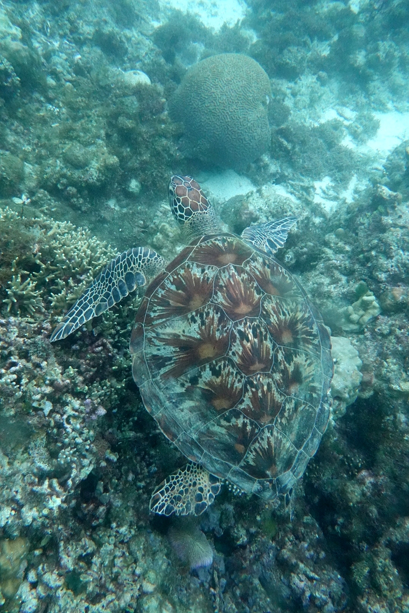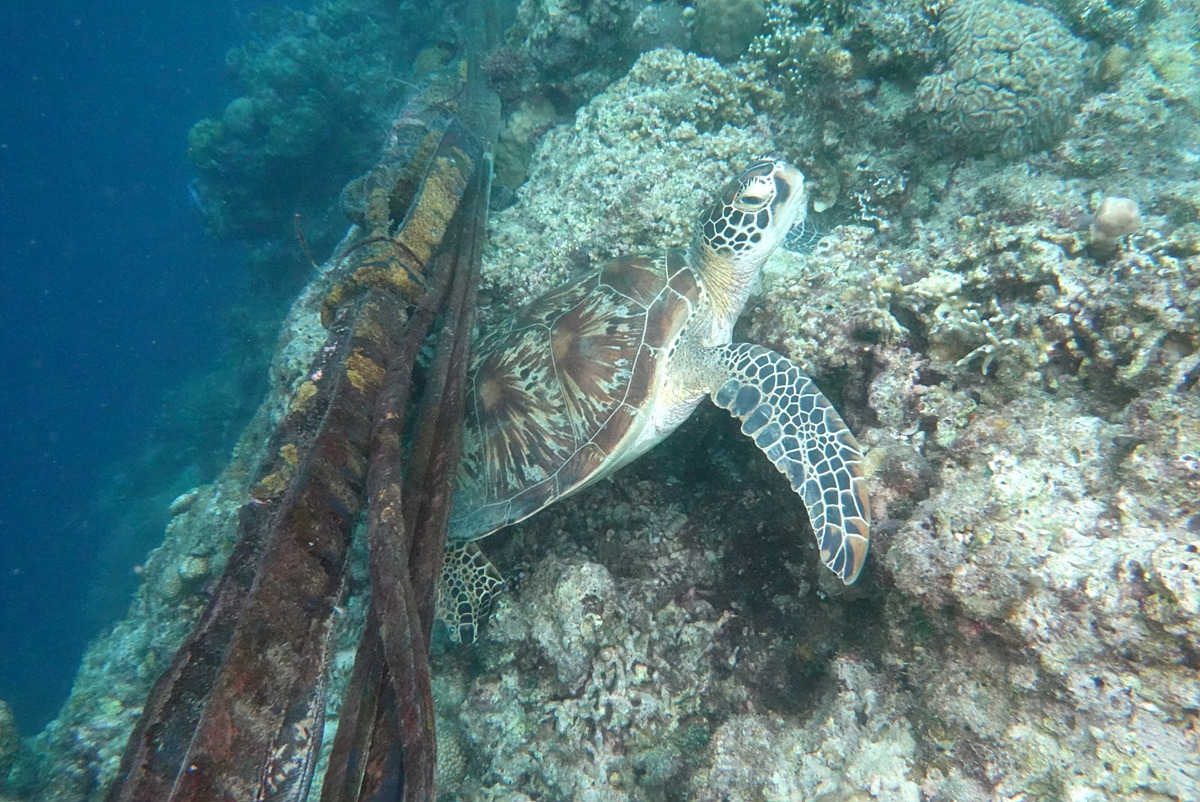 아무리 흔해도 아무리 봐도 질리지 않는 바다거북이다. 부표 고정 밧줄에 등딱지를 비벼 청소 중이다. 청소 끝내고 유유히 사라진다.