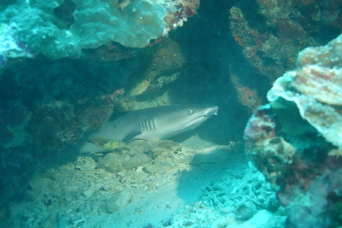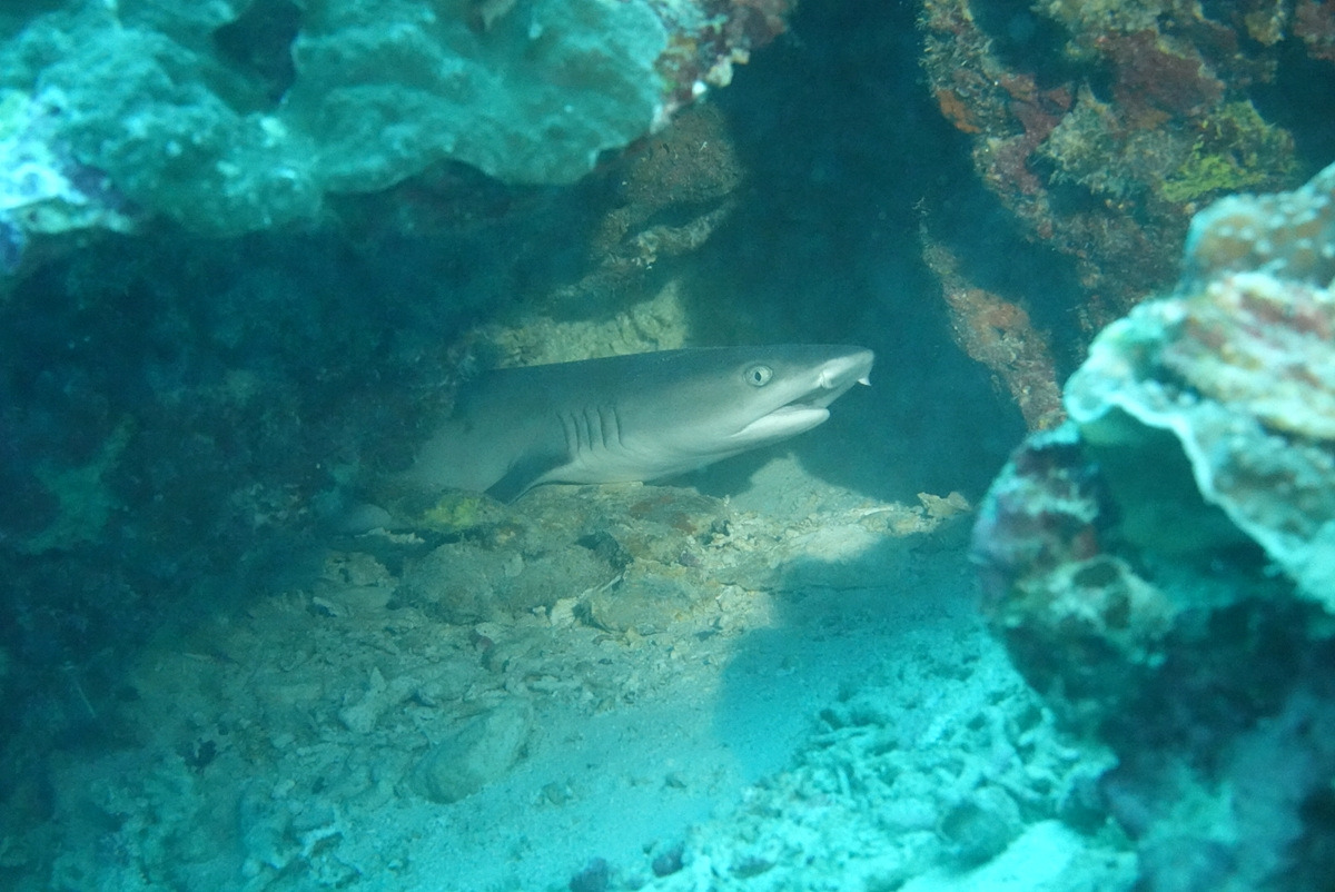구멍에 사는 새끼 화이트팁 샤크도 얼굴을 보여준다.