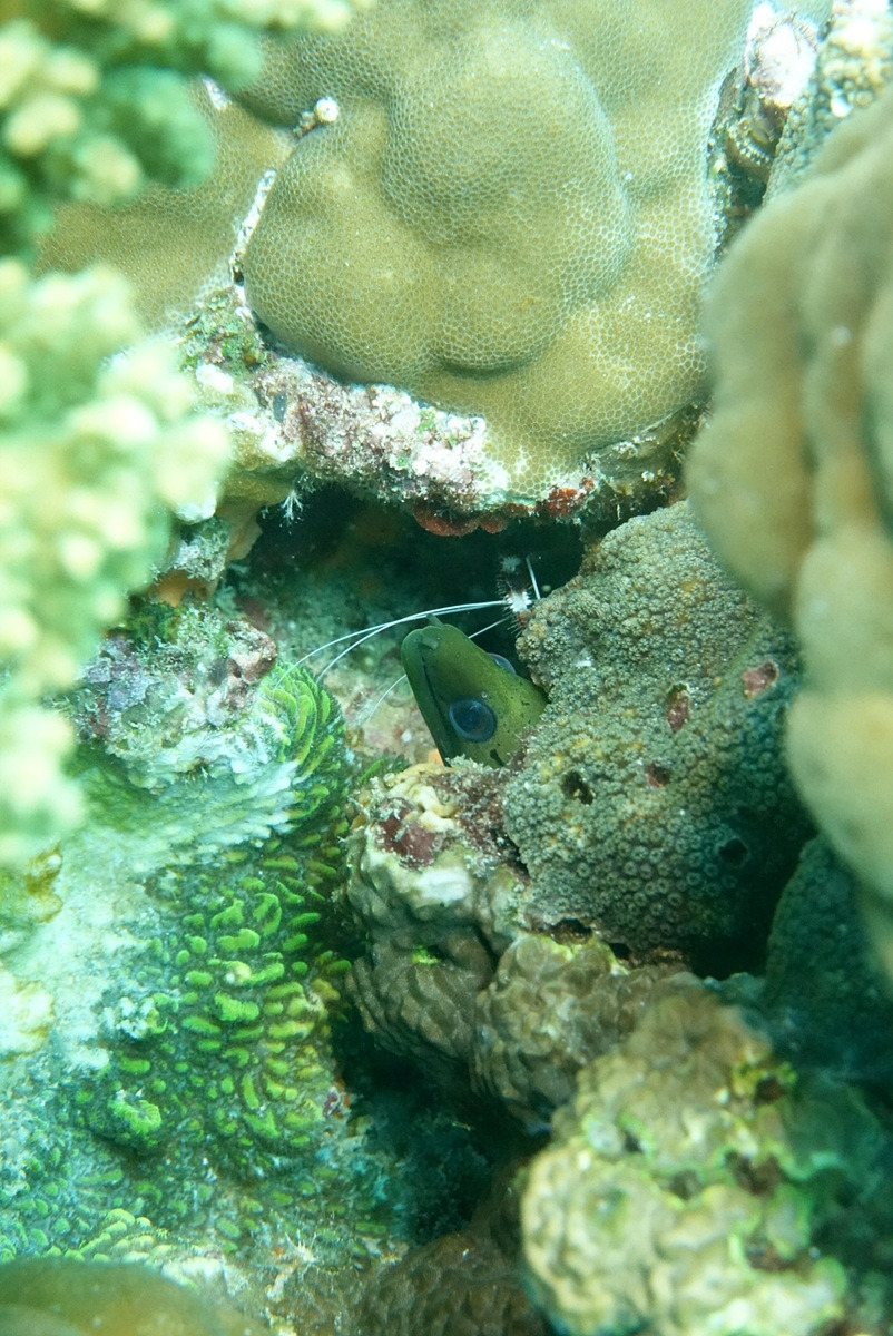 곰치와 밴디드 코랄 쉬림프는 같은 구멍에서 사는 경우가 꽤 있다.