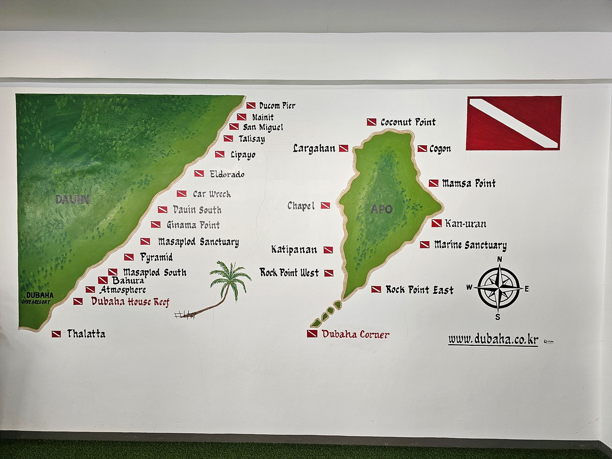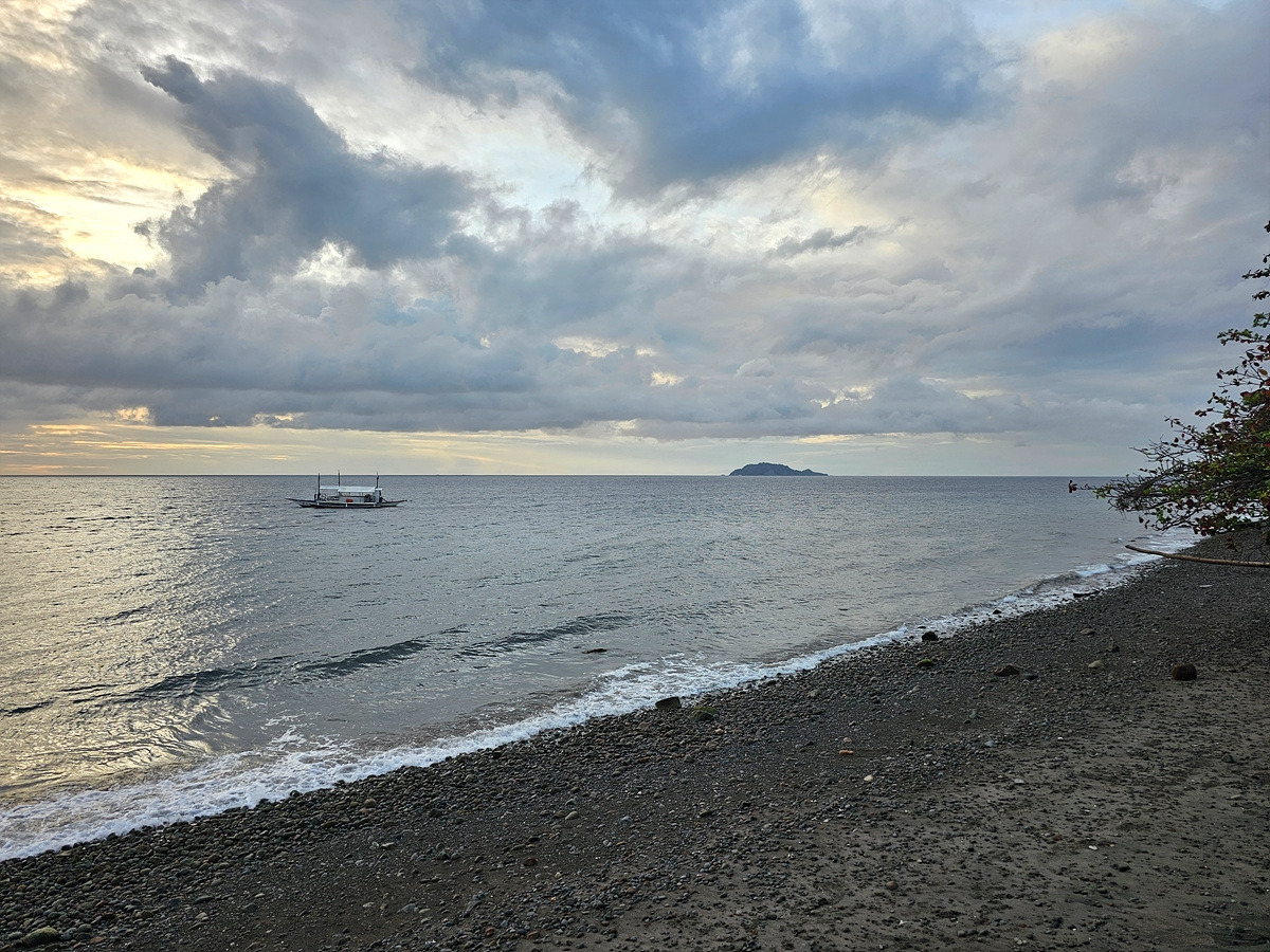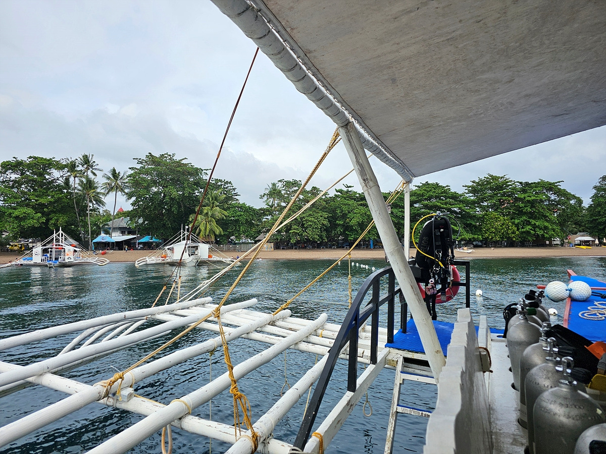 밤비행기에서 자야 하는 필리핀의 다른 다이빙 지역과 달리 정상적으로 자야 할 시간에 자고 일어나니 컨디션이 좋다. 리조트는 저기 보이는 아포섬에 다이빙하러 가기 좋은 위치다. 아포섬뿐만 아니라 이 앞바다도 충분히 좋다고 한다.