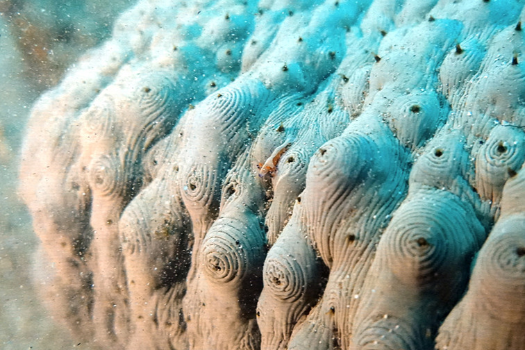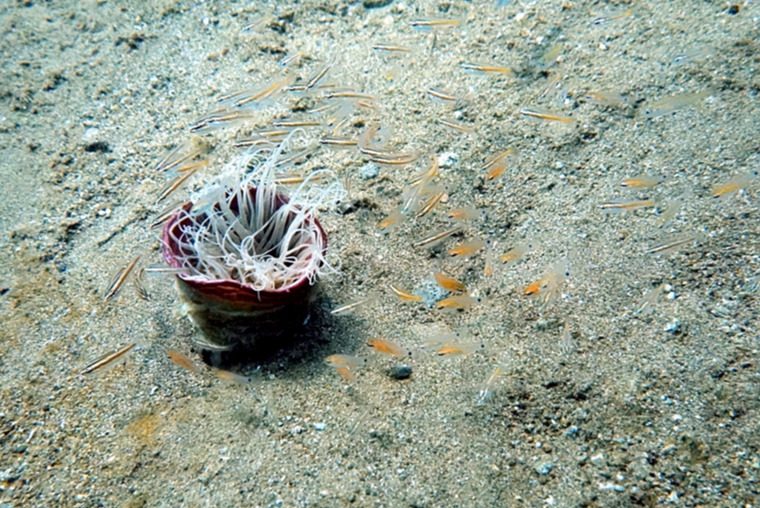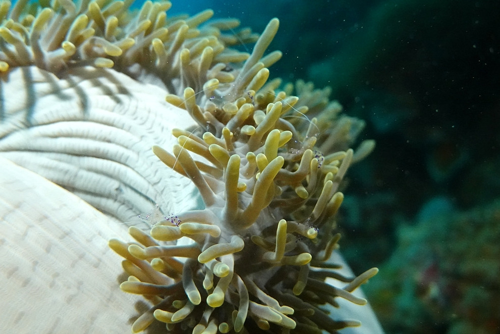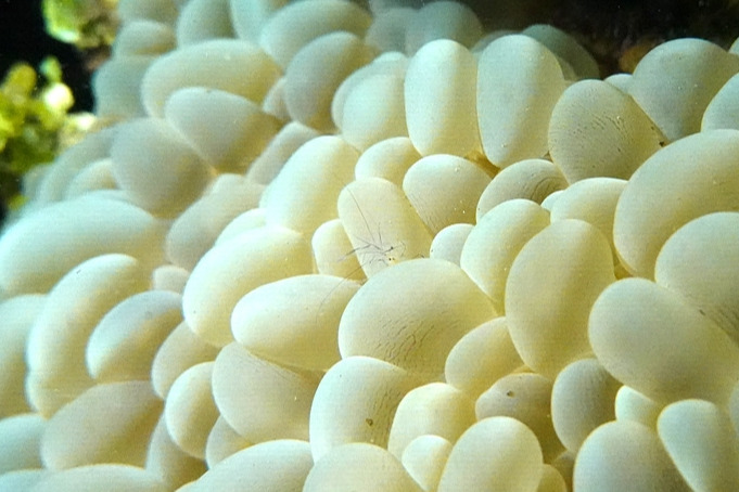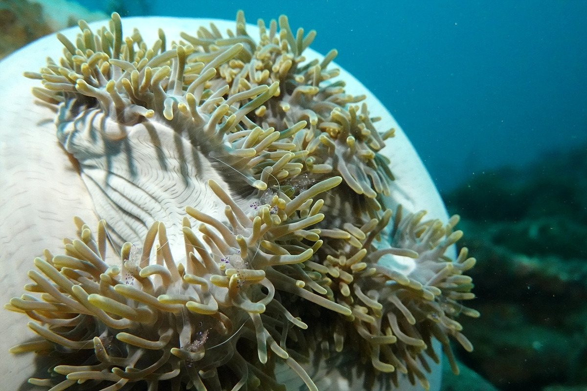 움츠린 말미잘에 새우 여럿이 붙어있다.