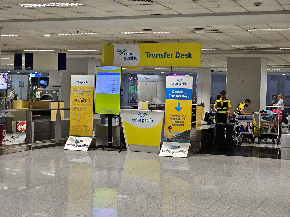 마닐라 공항은 터미널이 여러 개라 국내선으로 환승할 때는 다른 터미널로 이동할 수도 있다. 나처럼 인천에서 두마게티까지 세부 퍼시픽의 비행기로만 갈 경우는 같은 건물의 국제선 입국장에서 국내선 출발층으로 가면 된다. 다른 건물로 이동할 필요는 없지만 자가 환승이다. 국제선 짐 찾는 곳에서 짐을 찾고 나오면서 다시 국내선으로 짐을 보내야 한다. 수하물 찾는 곳에서 나가면서 보면 세부퍼시픽의 트랜스퍼 데스크가 있다. 여기에 짐을 맡기면 국내선 비행기에 실어준다. 국내선 항공권은 인천공항에서 발권했으니 짐 맡기고 그대로 국내선 게이트로 가면 된다.