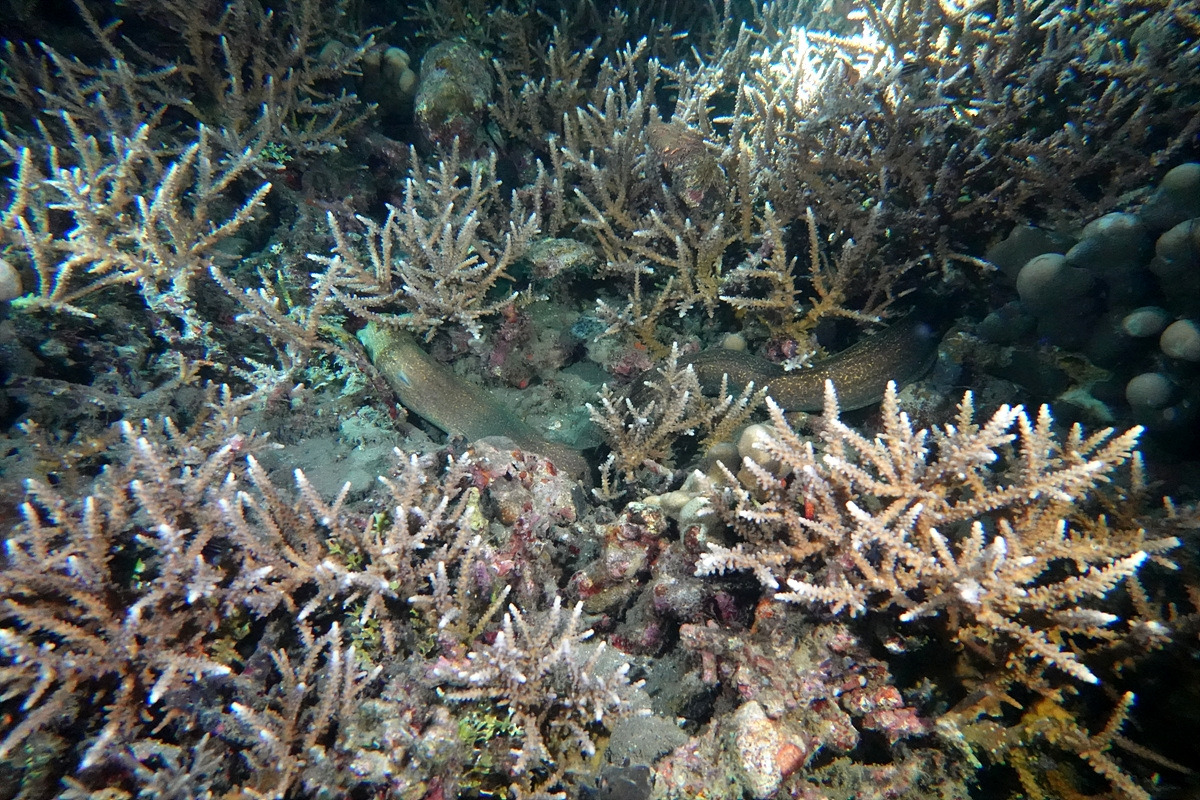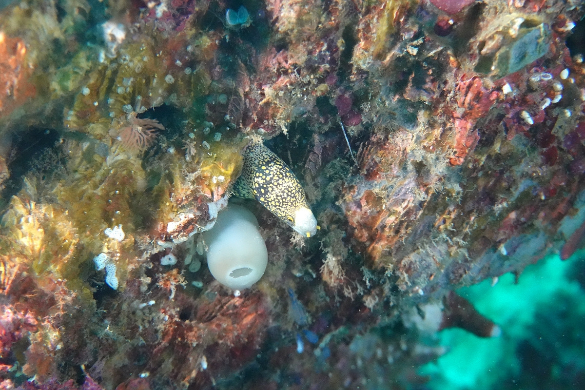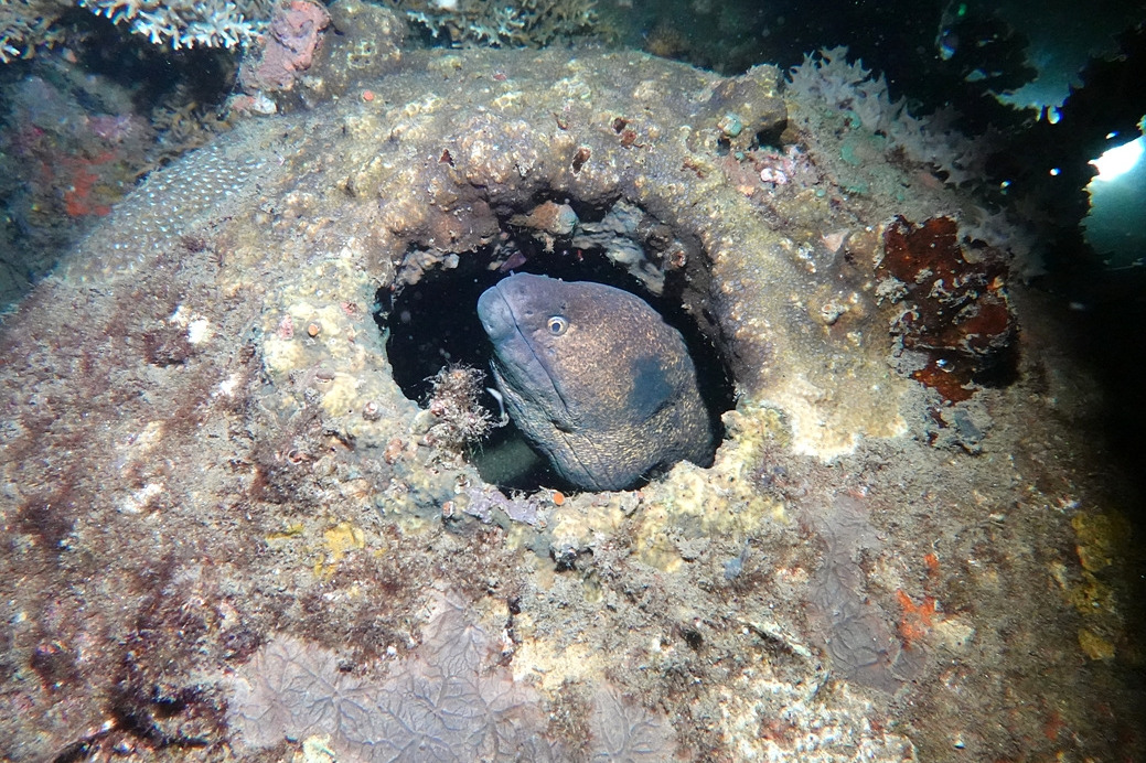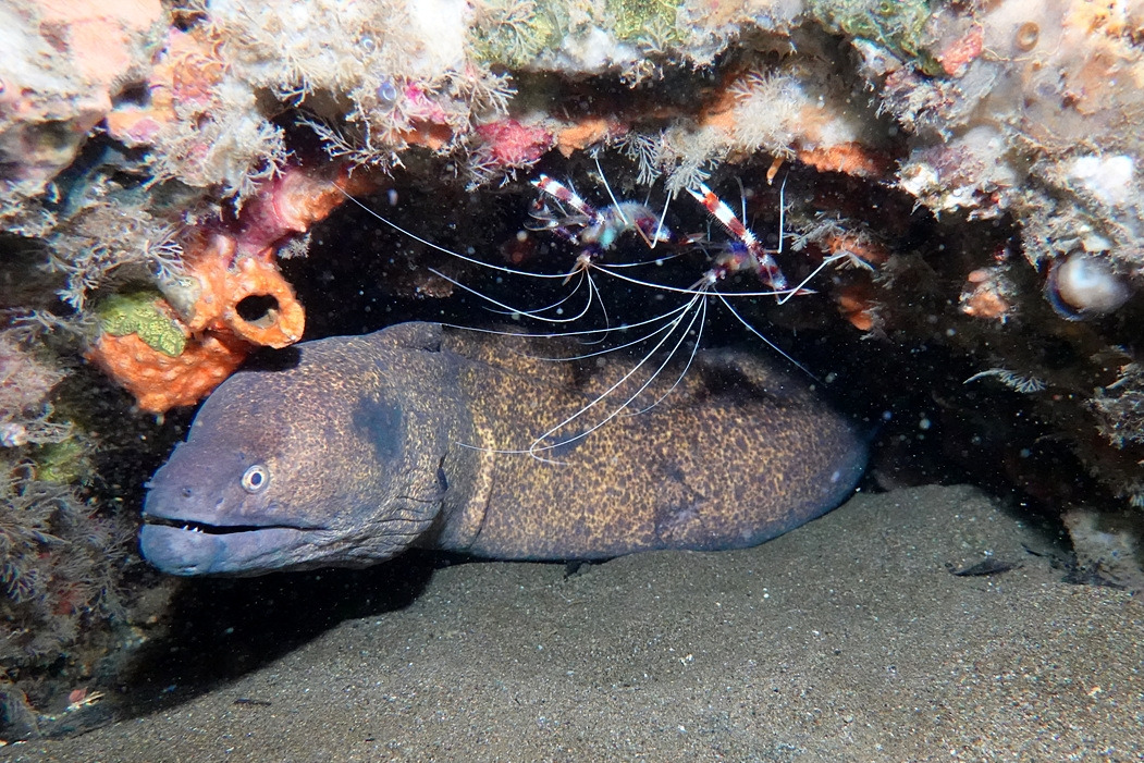 밴디드 코랄 쉬림프 커플과 큰 곰치가 한 구멍에 있다. 내가 사진 찍으려고 하니 귀찮은지 곰치가 쏙 빠져나간다.