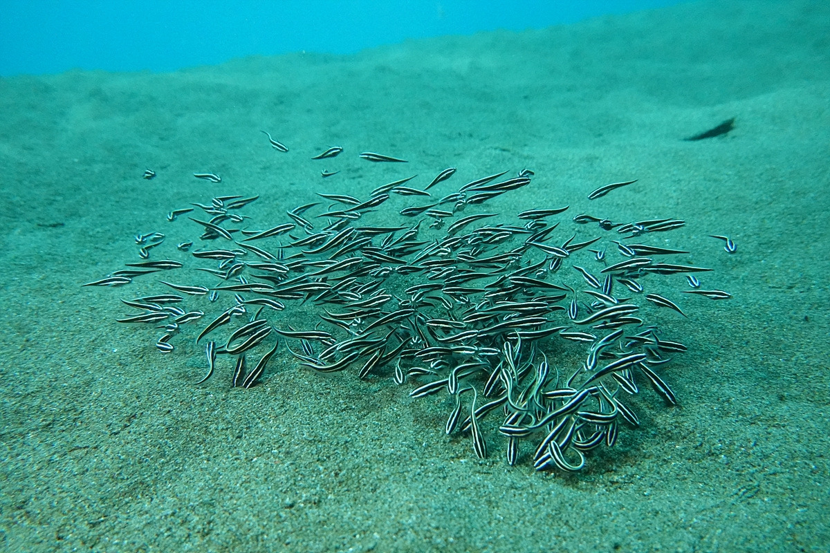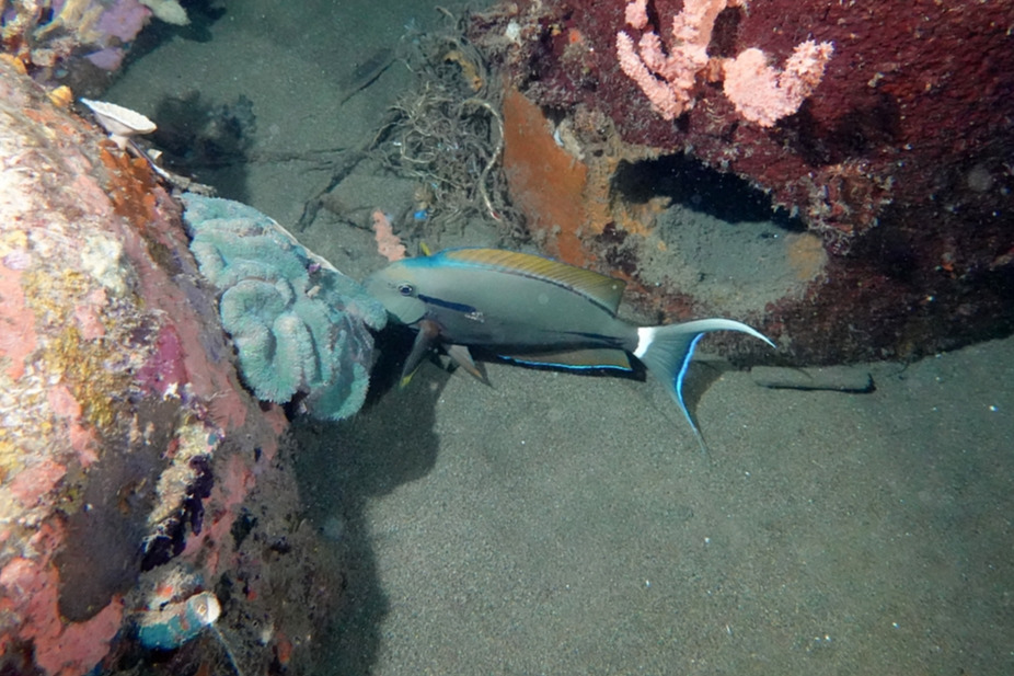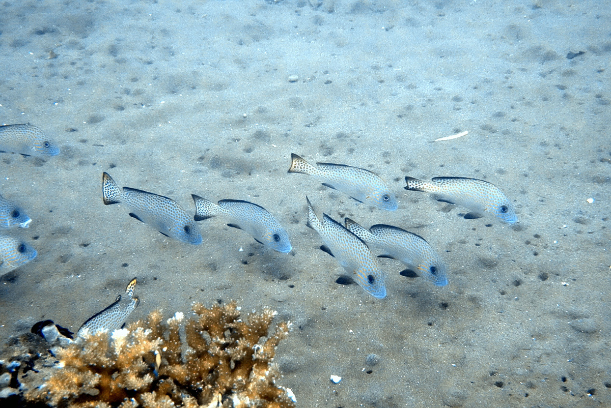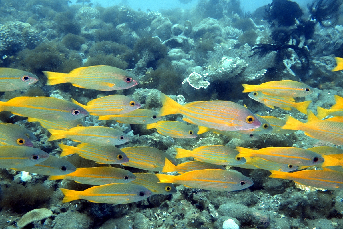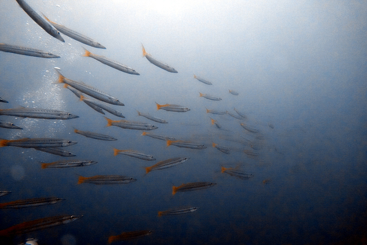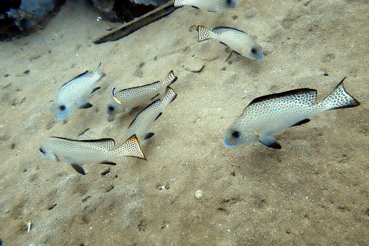 노랑꼬리 바라쿠다 떼가 지나간다. 원래 좀 작은 녀석들이다.