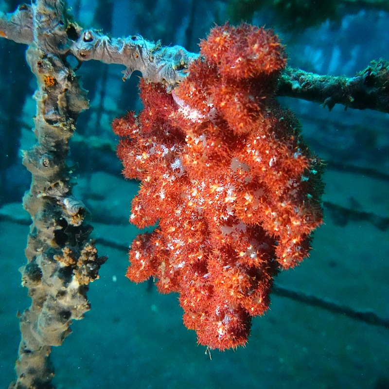 바다 맨드라미에 캔디 크랩이 붙어있다.