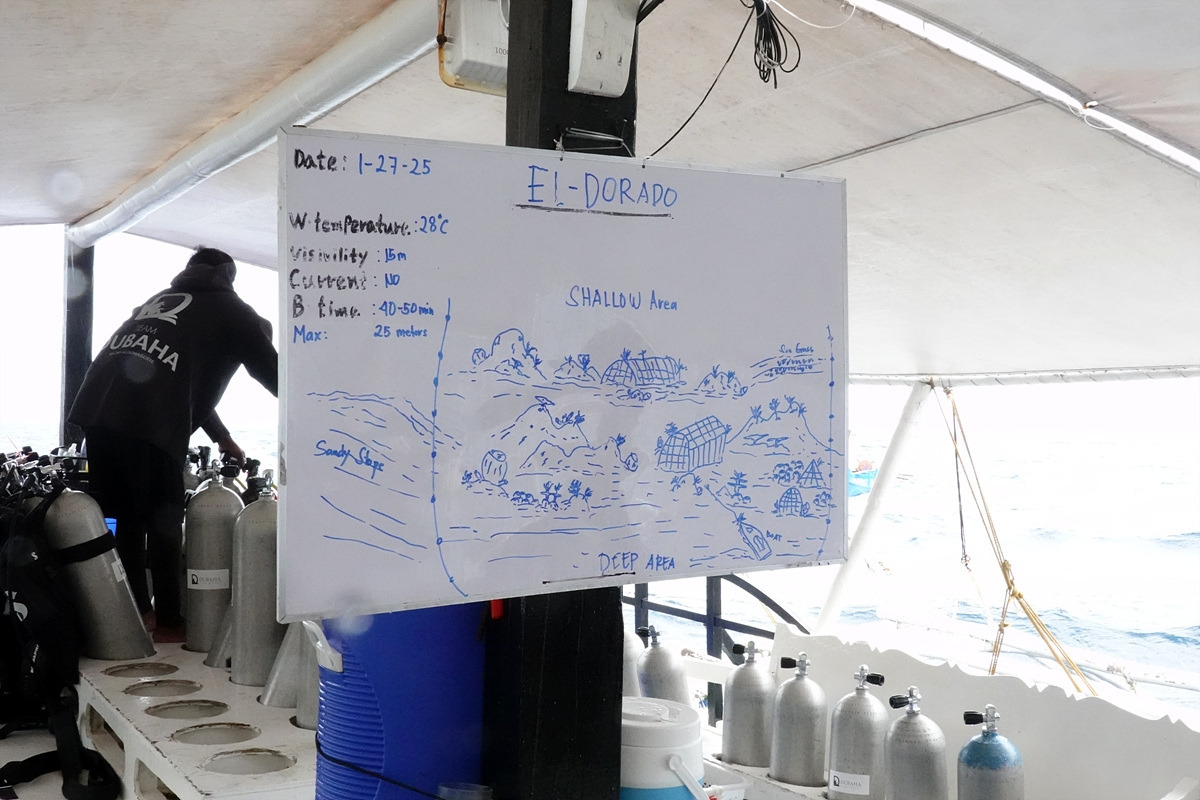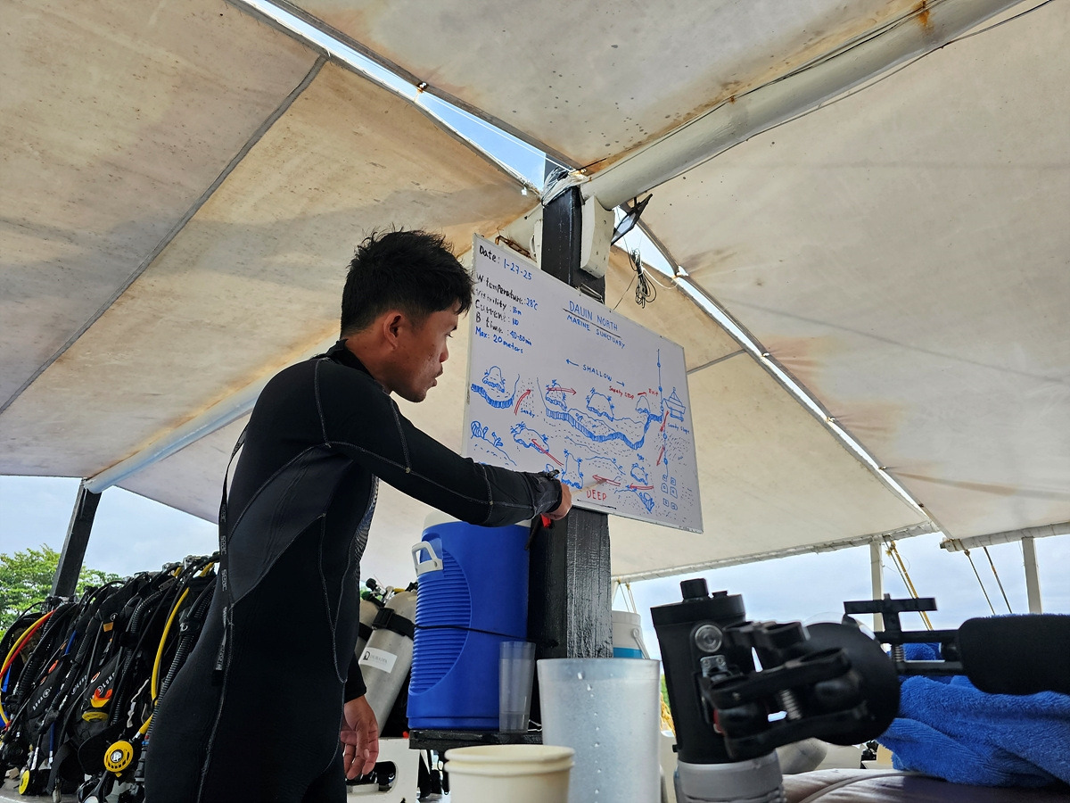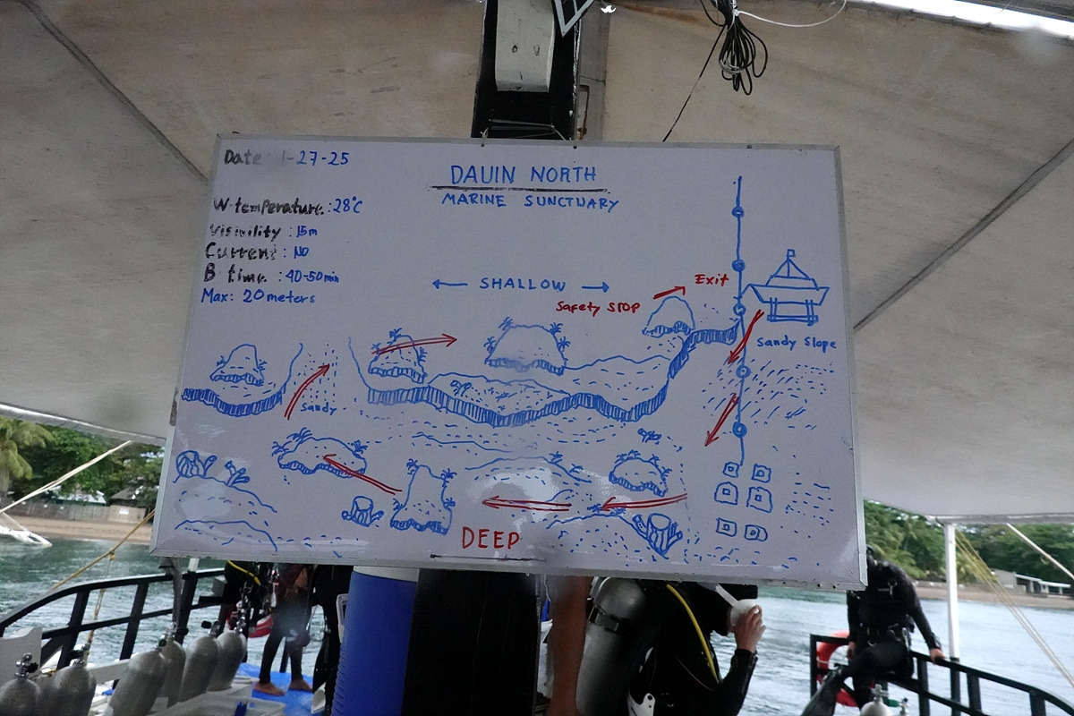 이 리조트는 출발 전에 브리핑 시간이 있고 사장님이 오늘 가는 포인트에 대한 대략적인 설명을 해준다. 다시 배에서 다이빙 전에 다시 상세한 브리핑을 한다. 오전에 엘도라도와 다우인 북쪽을 간다고 한다. 그 외에도 공지할 것이나 손님들의 요청 사항도 대부분 이 시간에 접수해서 처리한다.