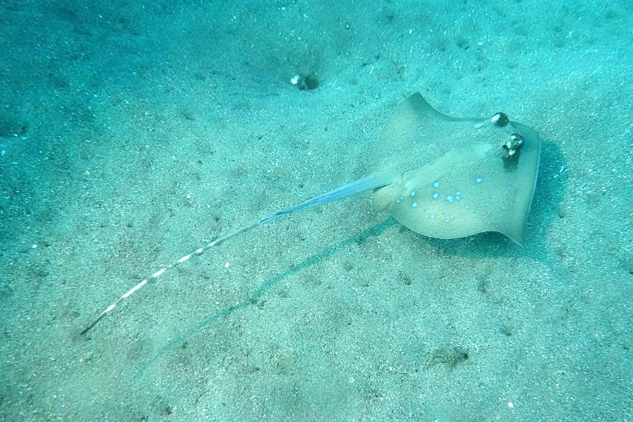 모래에서 가오리를 발견했다. 이 녀석... 화려한 녀석인데 이대로 모래에 숨어있는 것만 보는 건 아쉽다. 다른 사람들이 충분히 보고 나서 이동하기 전에 날려봐야겠다.