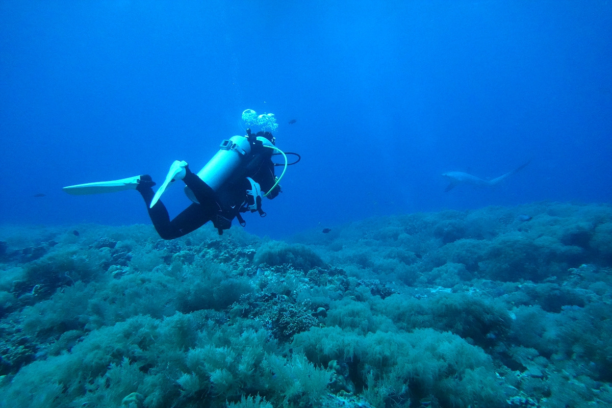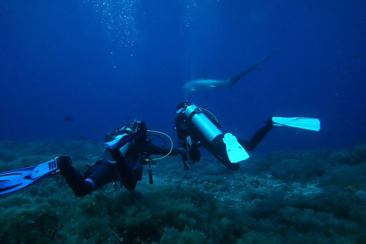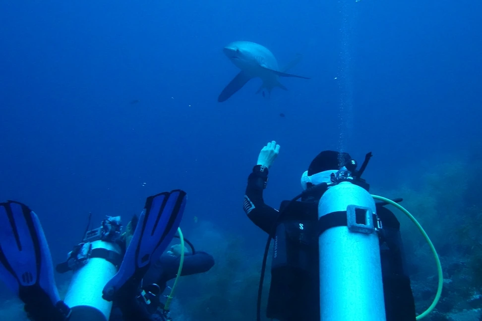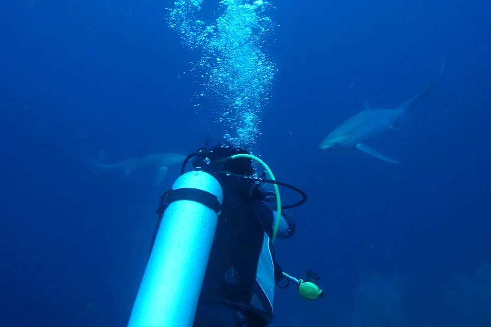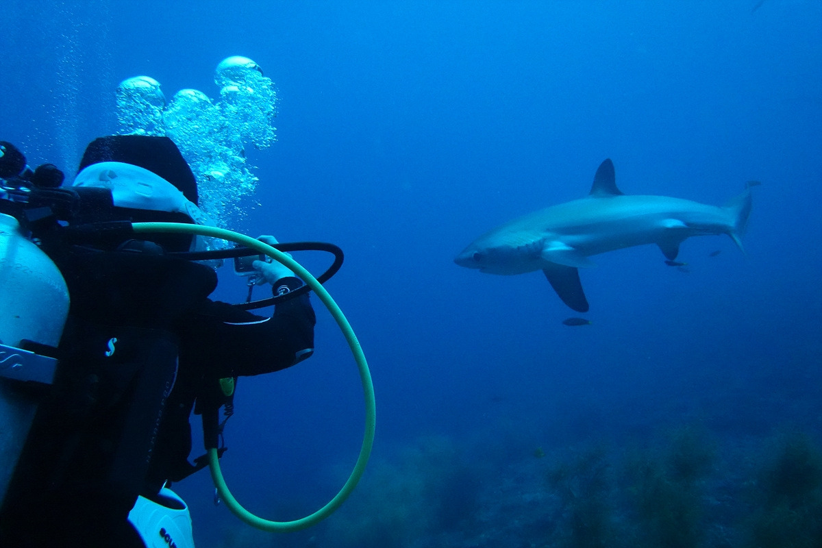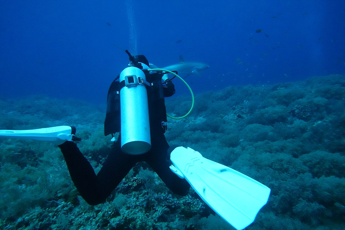 입수해서 바닥에 거의 근접했다. 바로 근처에 환도상어들이 보이기 시작한다. 재작년에 왔을 때는 환도상어가 자주 안 나오고 나와도 가까이 오는 경우가 많지 않았는데 그 사이 많이 변한 것 같다. 지금은 환도상어들도 수가 많이 늘어나고 다이버에 익숙해졌는지 그리 경계하지 않는 느낌이다.