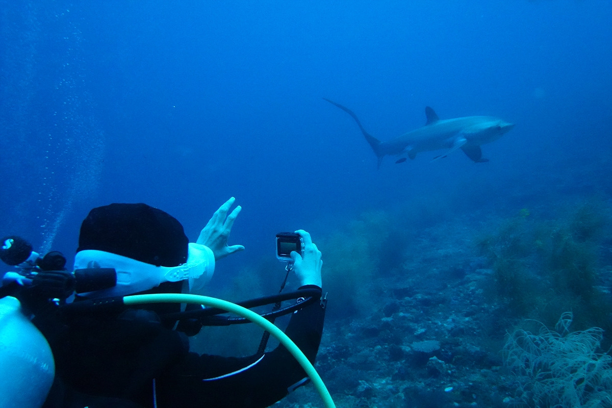 카메라 장비를 가지고 들어갔지만 작은 생물들이 보여도 환도상어를 자극할까 봐 다이빙 내내 조명은 켜질 않았다. 환도상어의 큰 눈이 빛에 엄청 예민하기 때문에 레드라이트도 안된다고 한다.