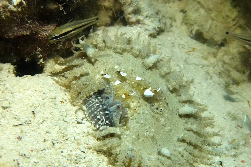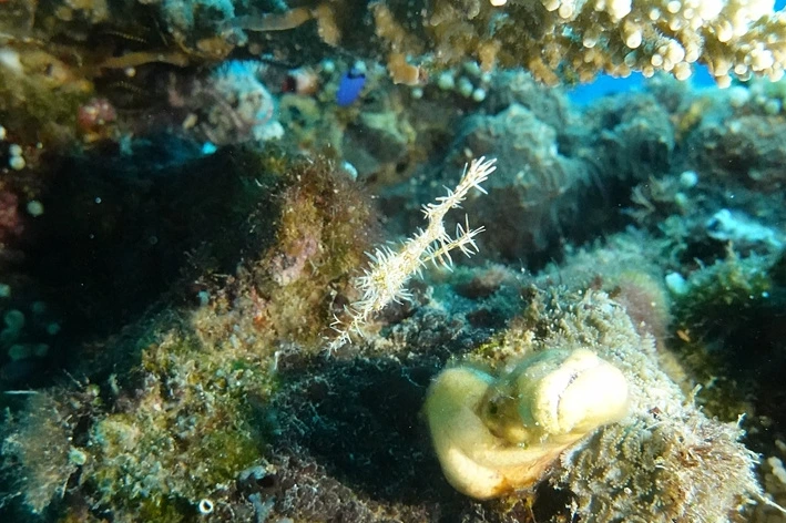 무언가를 보았다면 그냥 지나치지 말고 그 주변도 한 번 살펴보는 게 좋다. 고스트 파이프 피쉬 아래로 바위틈에 새우 두 마리가 날 쳐다보고 있다.