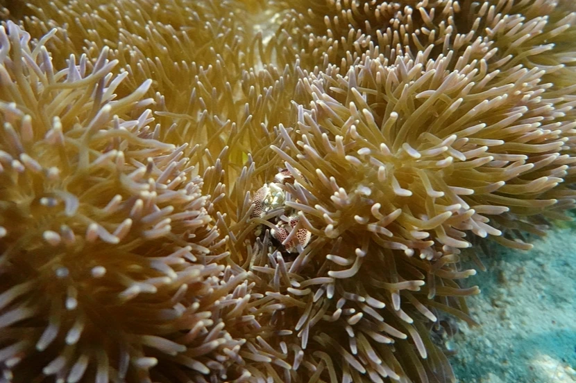퍼져있는 말미잘에 새우들이 붙어있다.