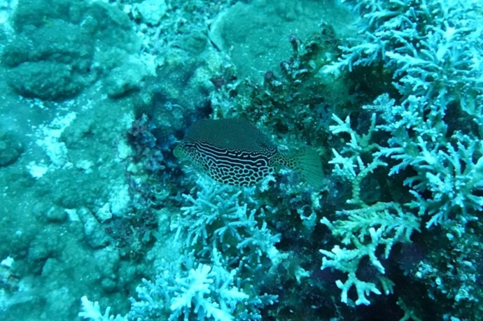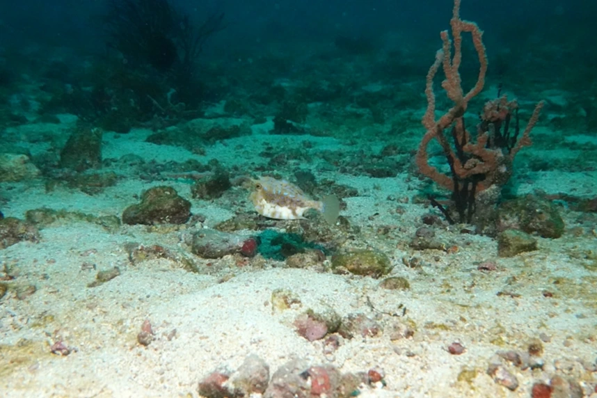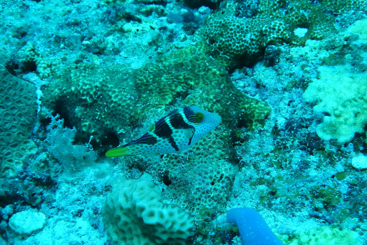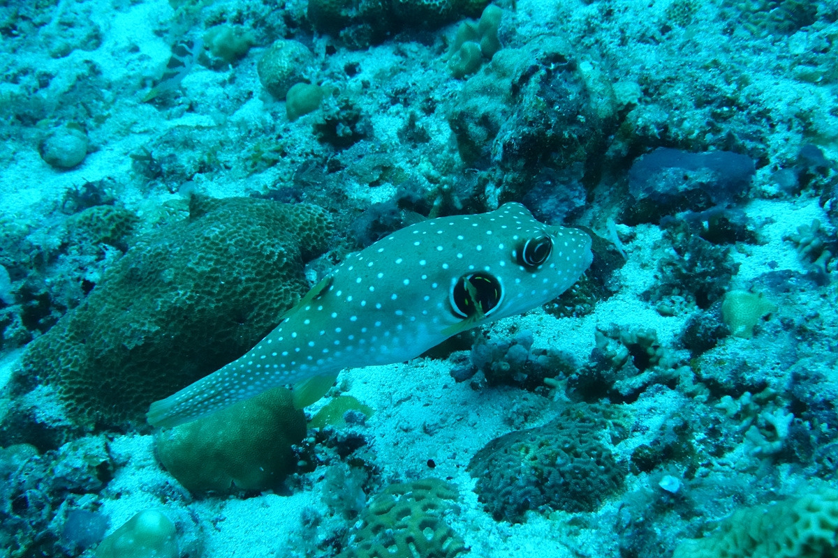 뿔복이 헤엄쳐 오다가 내가 조명을 켜니 도망간다.