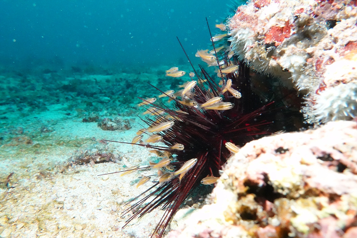 성게를 이용해서 몸을 보호하는 물고기 떼도 있다.