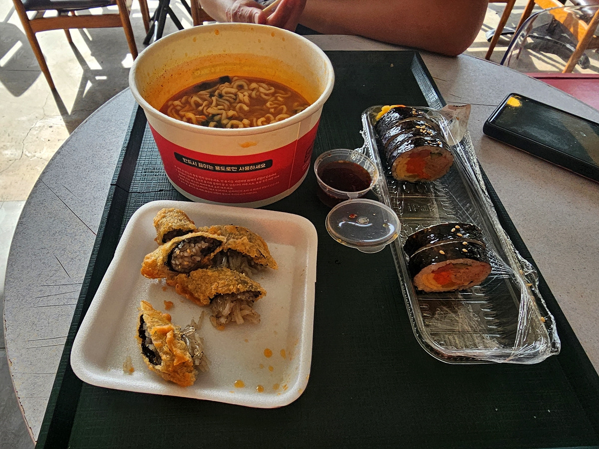 즉석 라면, 김밥, 왕김말이 튀김을 주문했는데 꽤 괜찮은 맛이다.