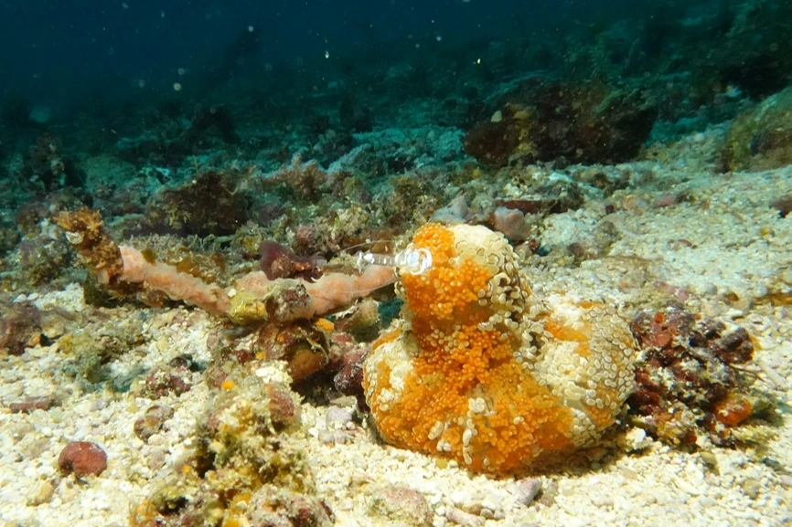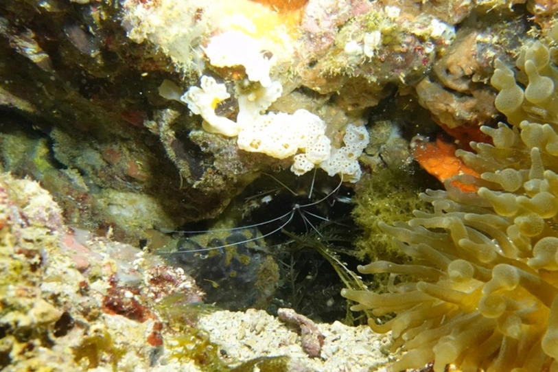 말미잘에 새우가 붙어있다.