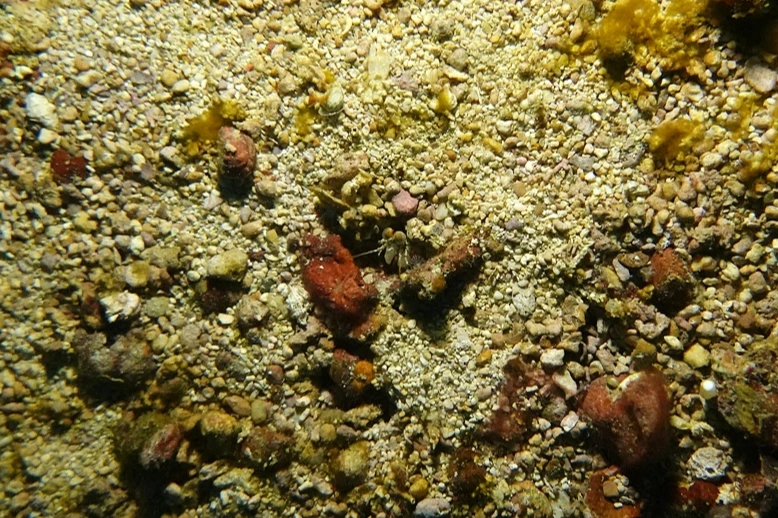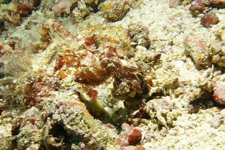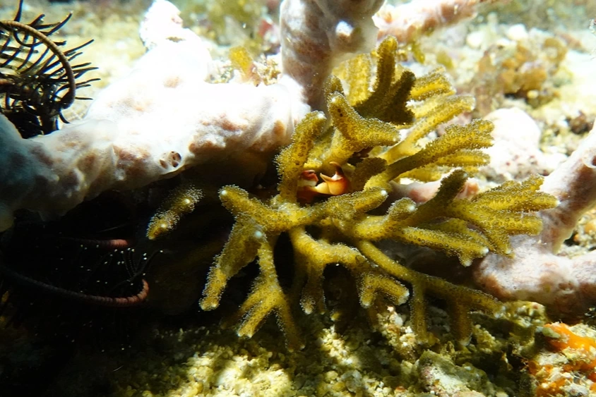 산호 사이에 집게발이 보인다.