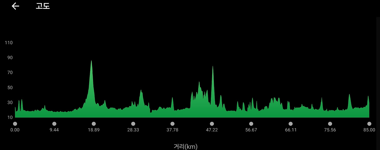 총 85km 코스로 검문소가 있는 평화 전망대 쪽 최북단까지 가진 않는다. 해안가와 평야 지대를 돌기 때문에 큰 오르막길은 없다.