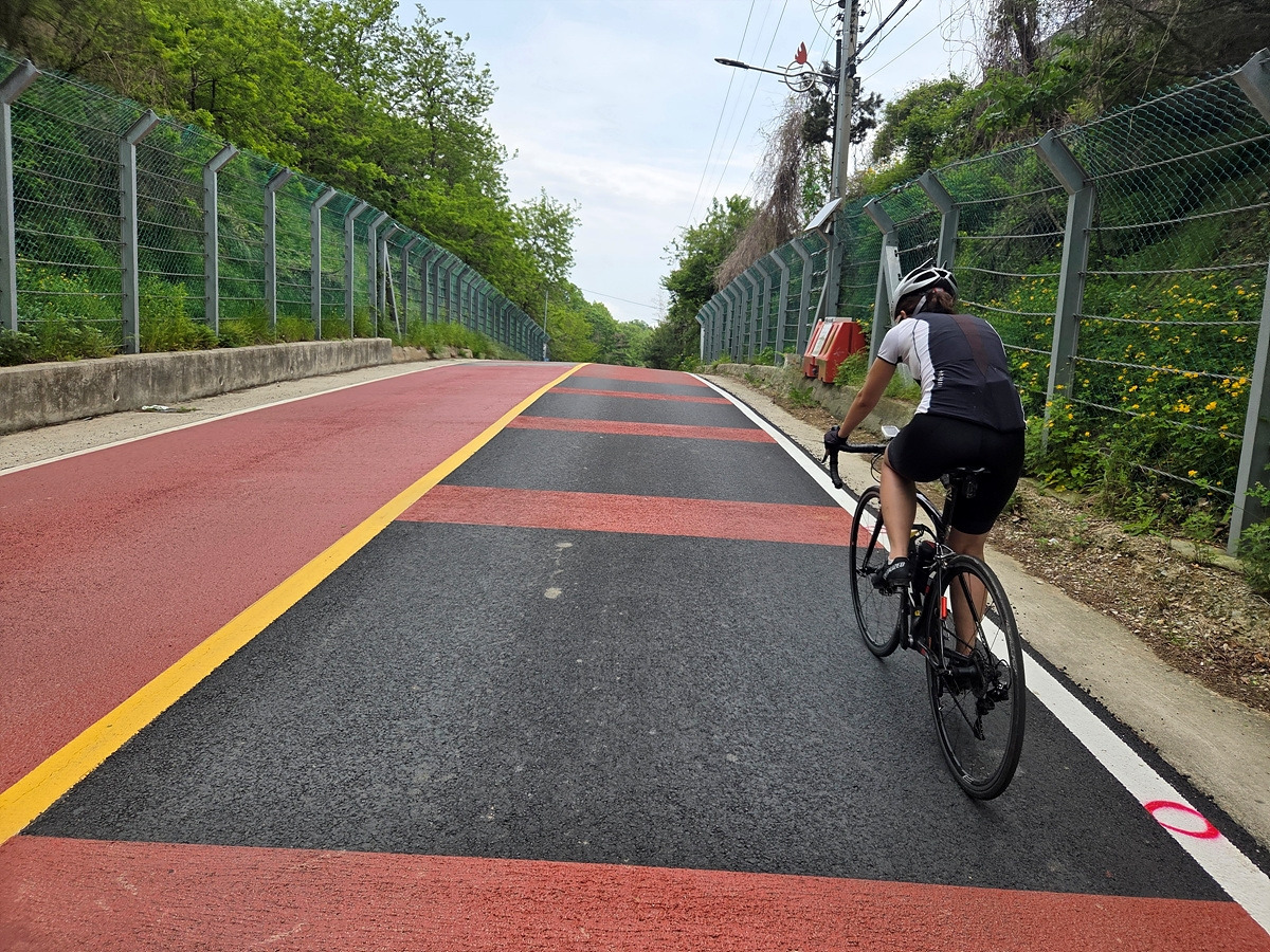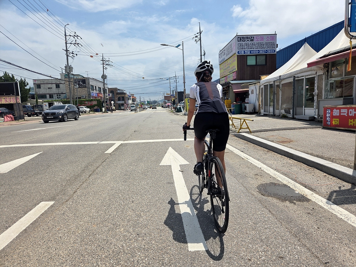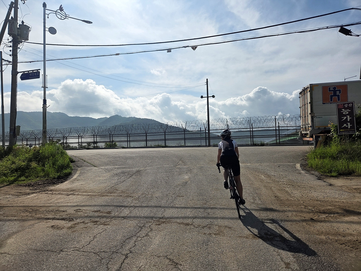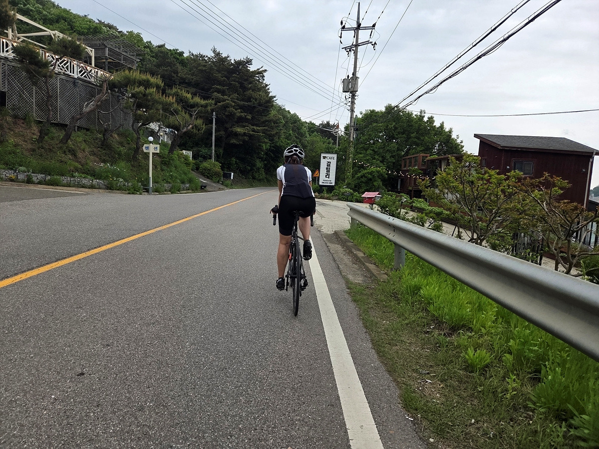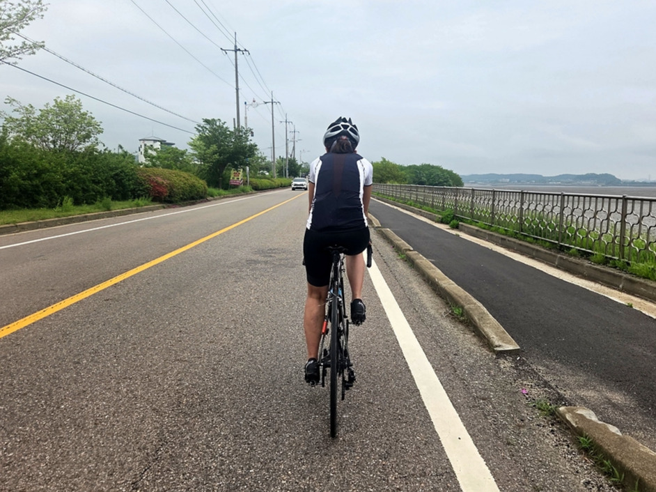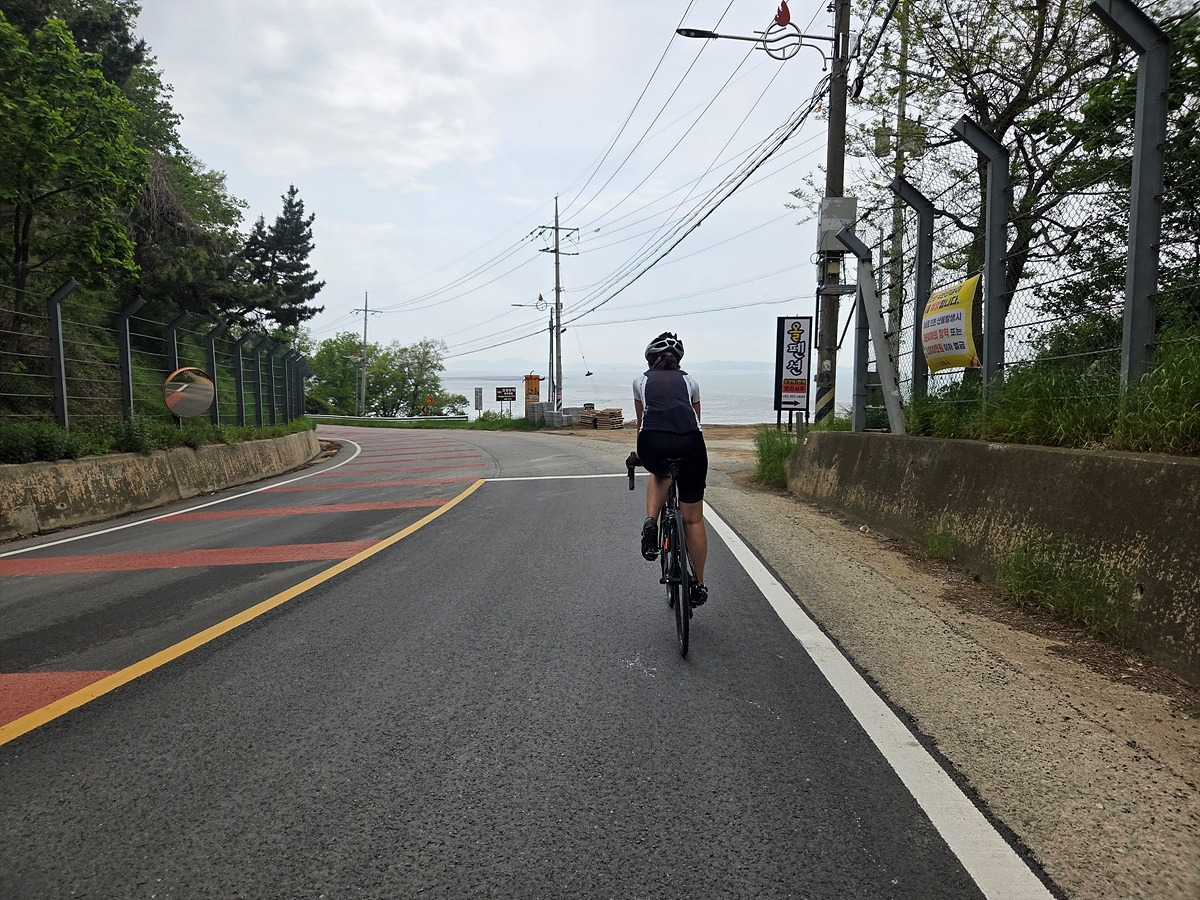 강화도 해안 자전거도로가 철책 따라서 이어진다. 이 구간은 차가 거의 안 다니는 데다가 자전거길에는 보행자가 종종 있어 그냥 차도로 달린다.
