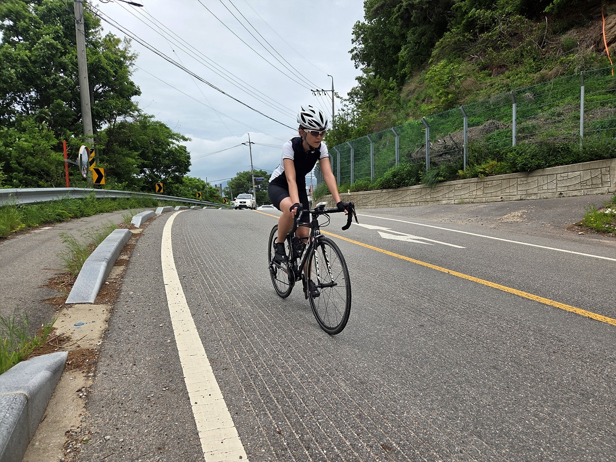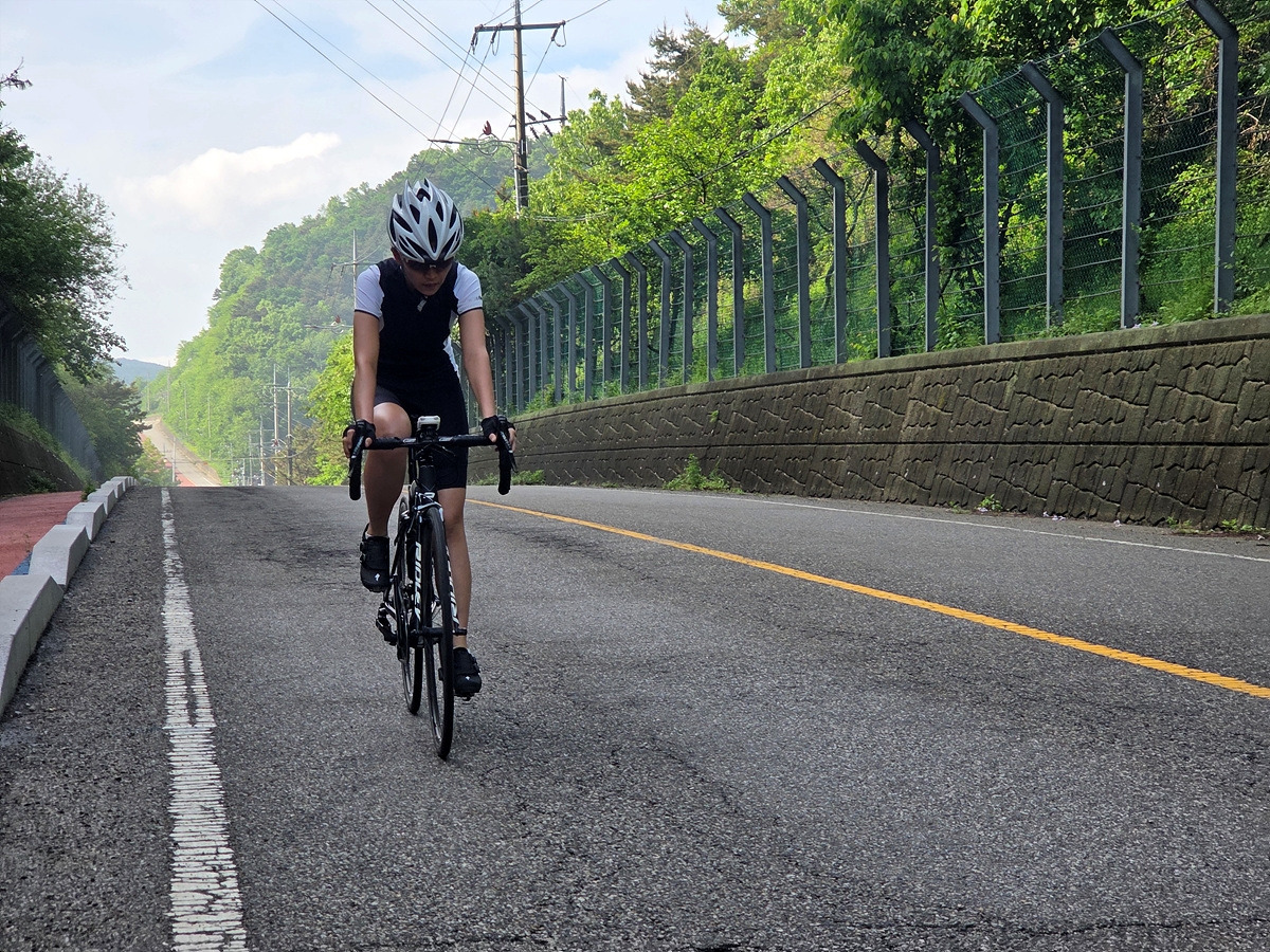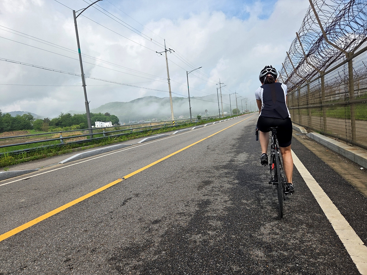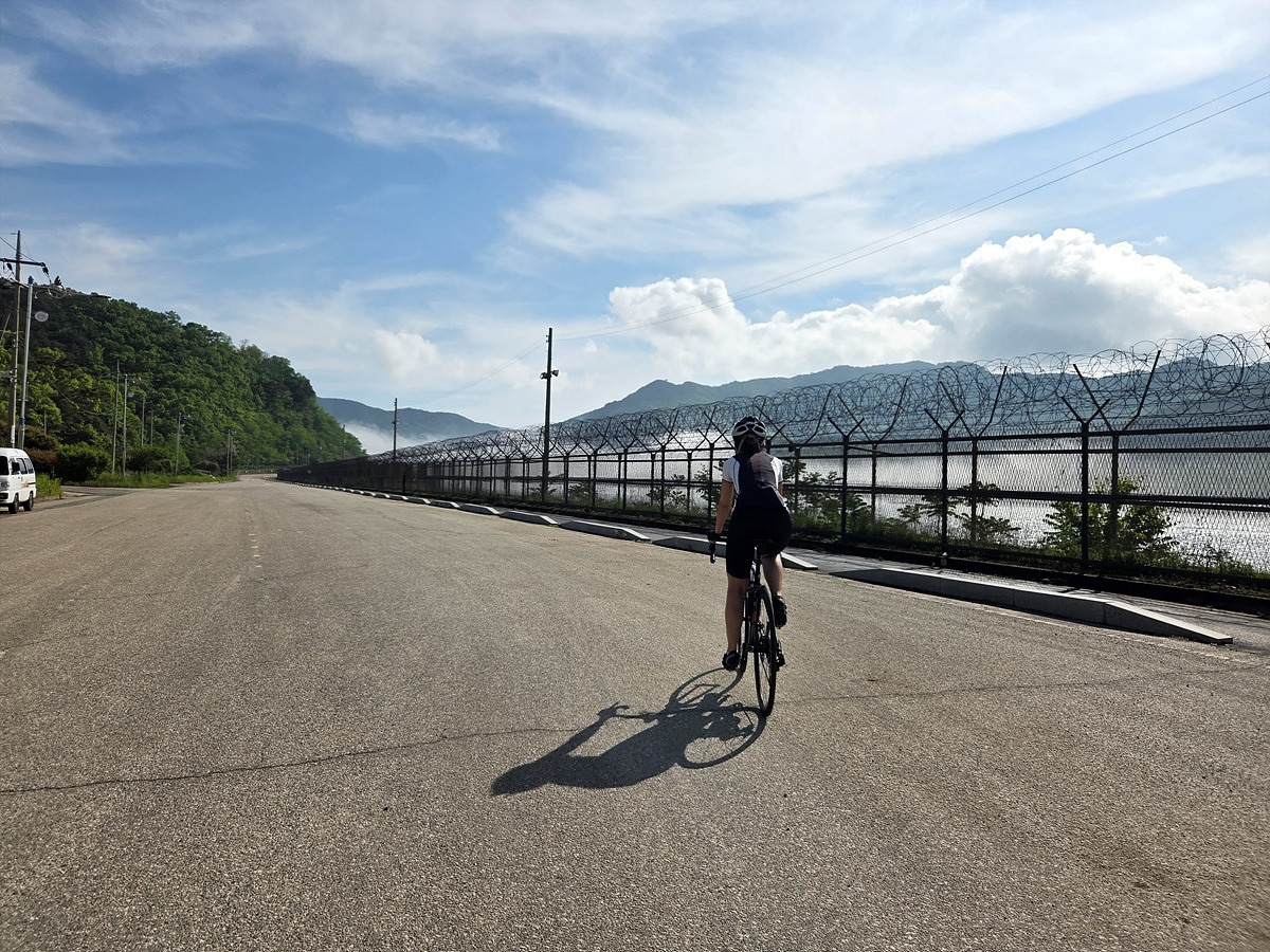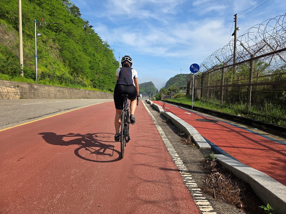 강화도 해안 자전거도로가 철책 따라서 이어진다. 이 구간은 차가 거의 안 다니는 데다가 자전거길에는 보행자가 종종 있어 그냥 차도로 달린다.