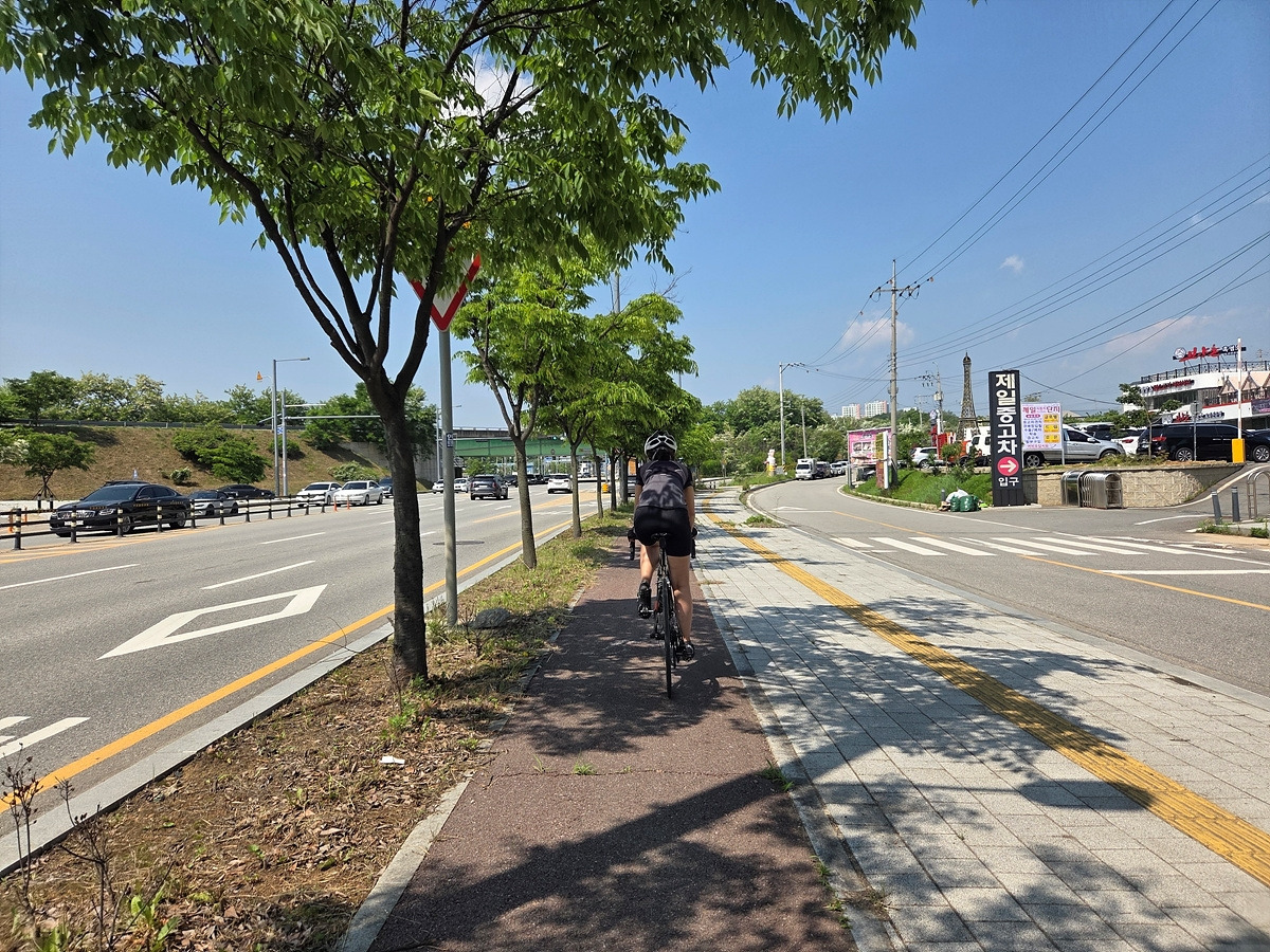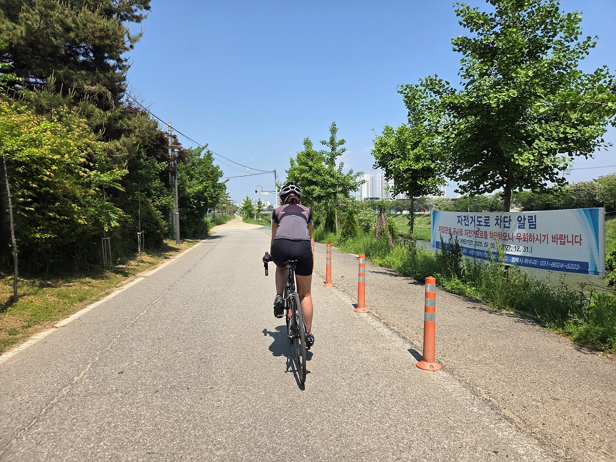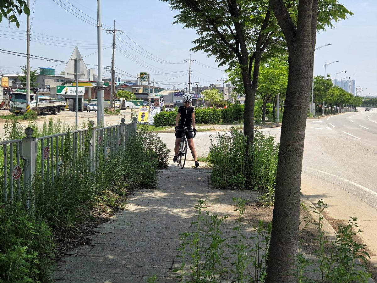 317번 도로인 백현대로도 공사로 엉망이다. 도로도 인도도 모두 엉망이라 자전거를 끌다시피 해서 겨우 통과한다. 언덕 꼭대기의 굴다리를 지나 조금 더 가니 공사구간이 끝나고 멀쩡한 길이 나온다.