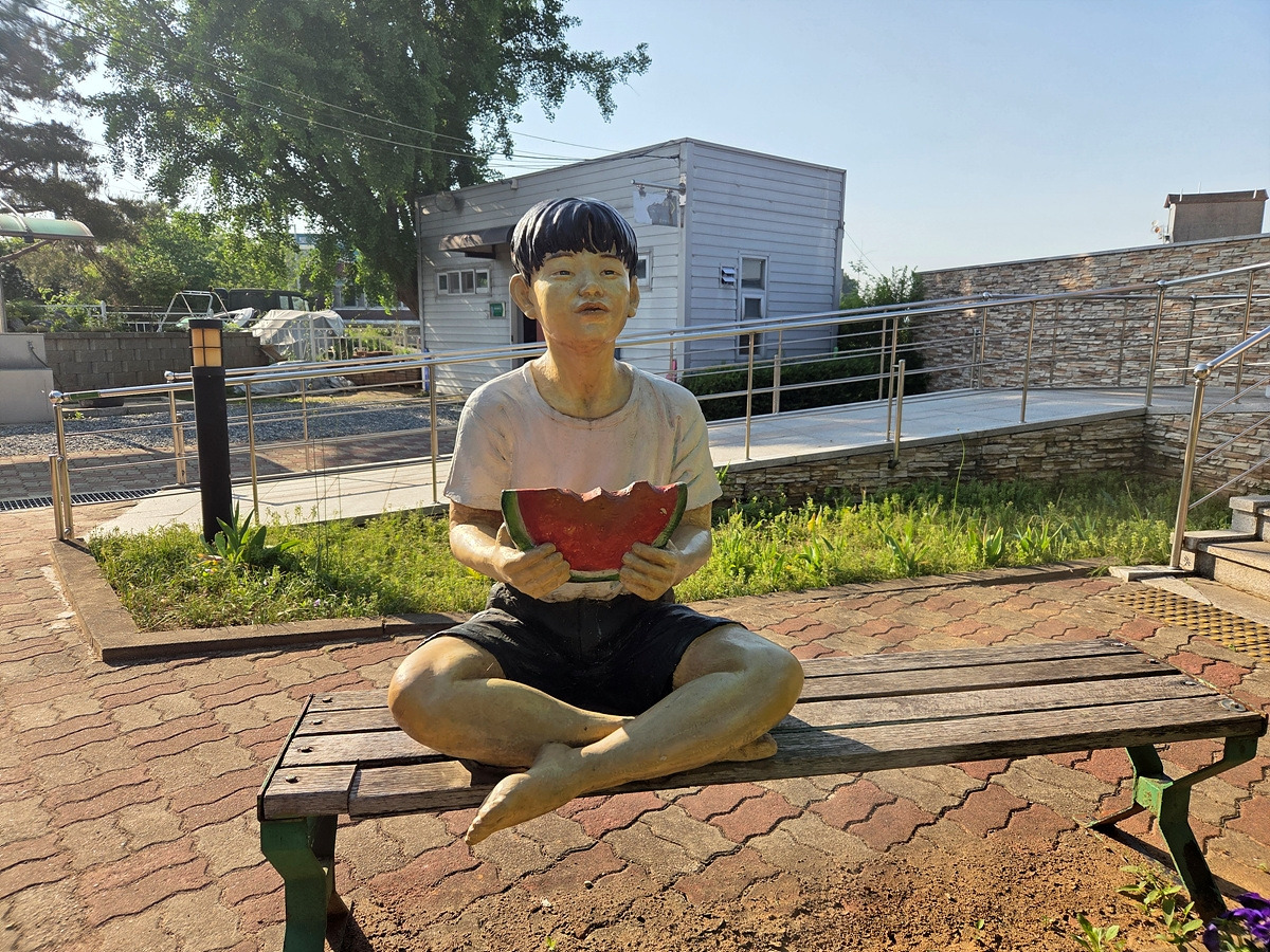아직 폐관 시간까지 여유가 있어 웃다리문화관을 둘러본다. 정문 앞에는 카메라 탈을 쓴 아이가 있더니 화장실 앞에는 수박 먹는 아이가 있다. 만화적이지도 사실적이지 않고 뭔가 오래된 교과서의 그림 같이 꼬질꼬질해 보인다.