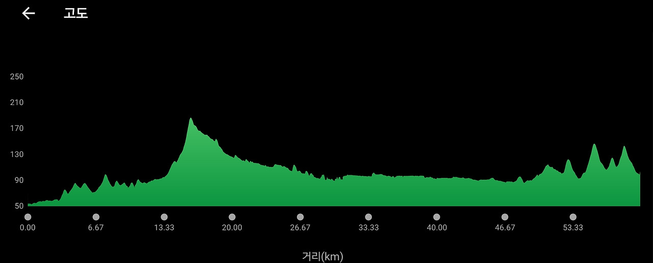 전체적으로 특별히 힘든 오르막길은 없고 마지막에 창남이 고개를 비롯한 작은 오르막길들이 있다.