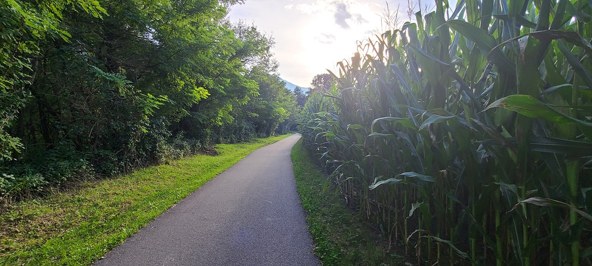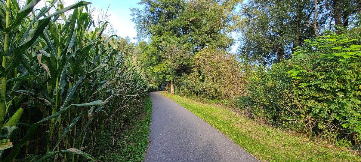 자전거 도로는 강을 따라가다가 다리를 건너서 나무 그늘 아래와 옥수수밭을 지나갔다. 길이 끊기면 어쩌나 하는 찰나에는 항상 안내 표지판이 이어진 경로를 계속해서 안내해 줬다.