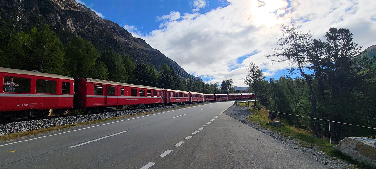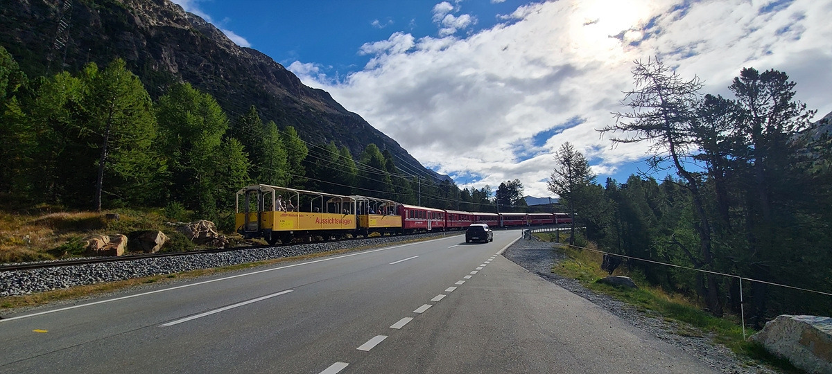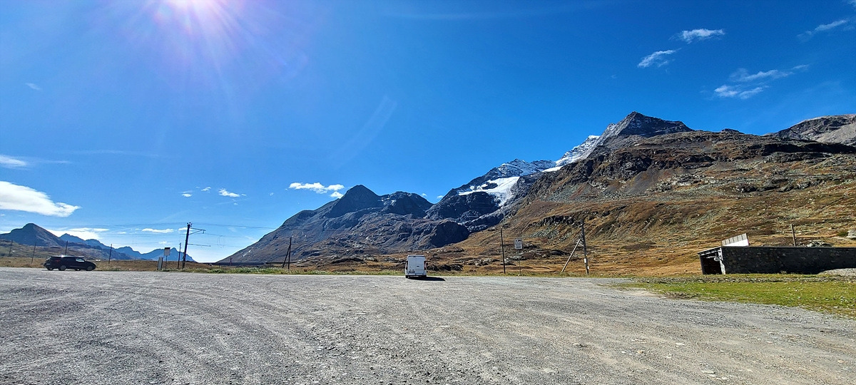 <존의 부연 설명: 베르니나 패스는 지니님이 어제 넘었던 알불라 패스와 함께 세계문화유산으로 지정된 산악 열차 노선인 베르니나 익스프레스가 지나가는 루트다. 사진 왼쪽 건물 뒤쪽으로 Ospizio Bernina 기차역이 있다.>